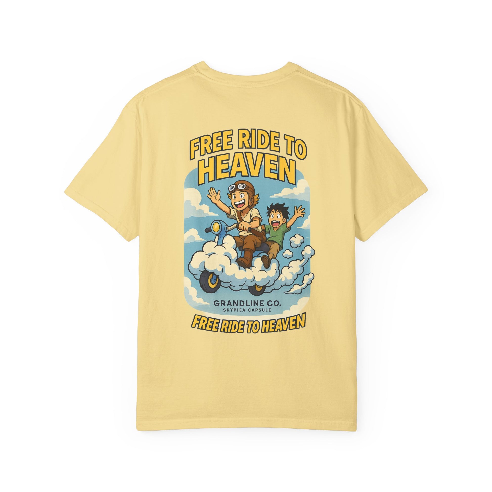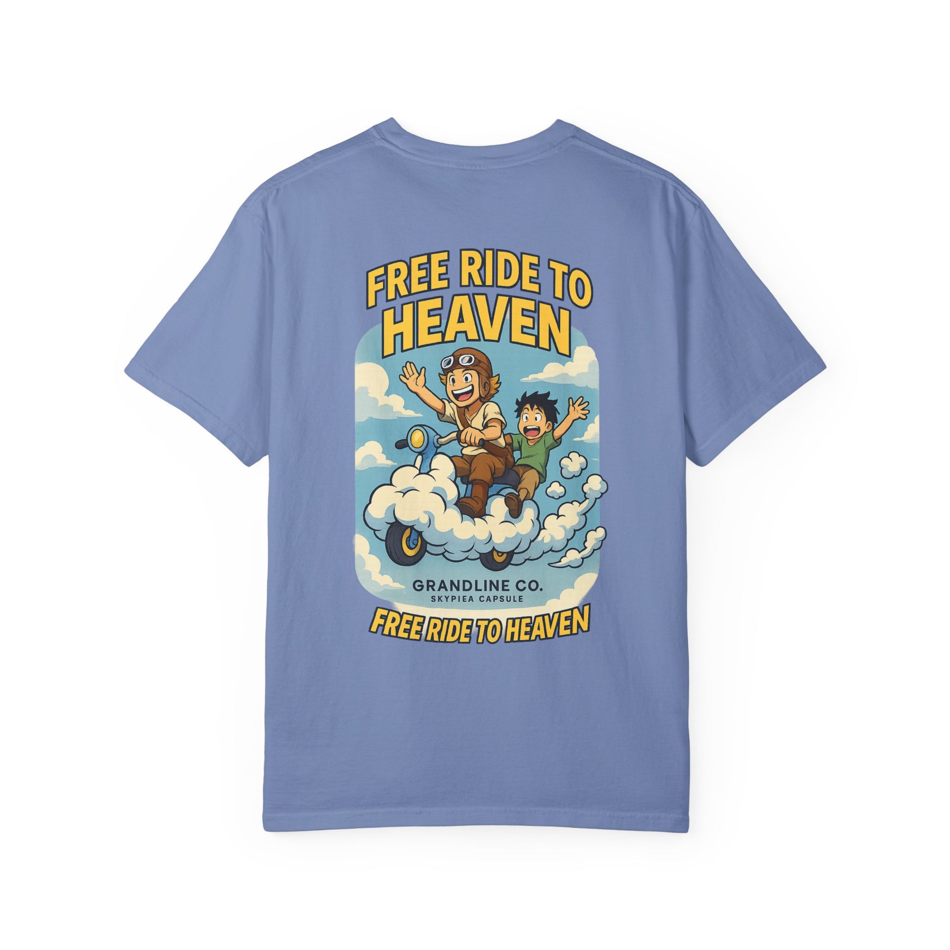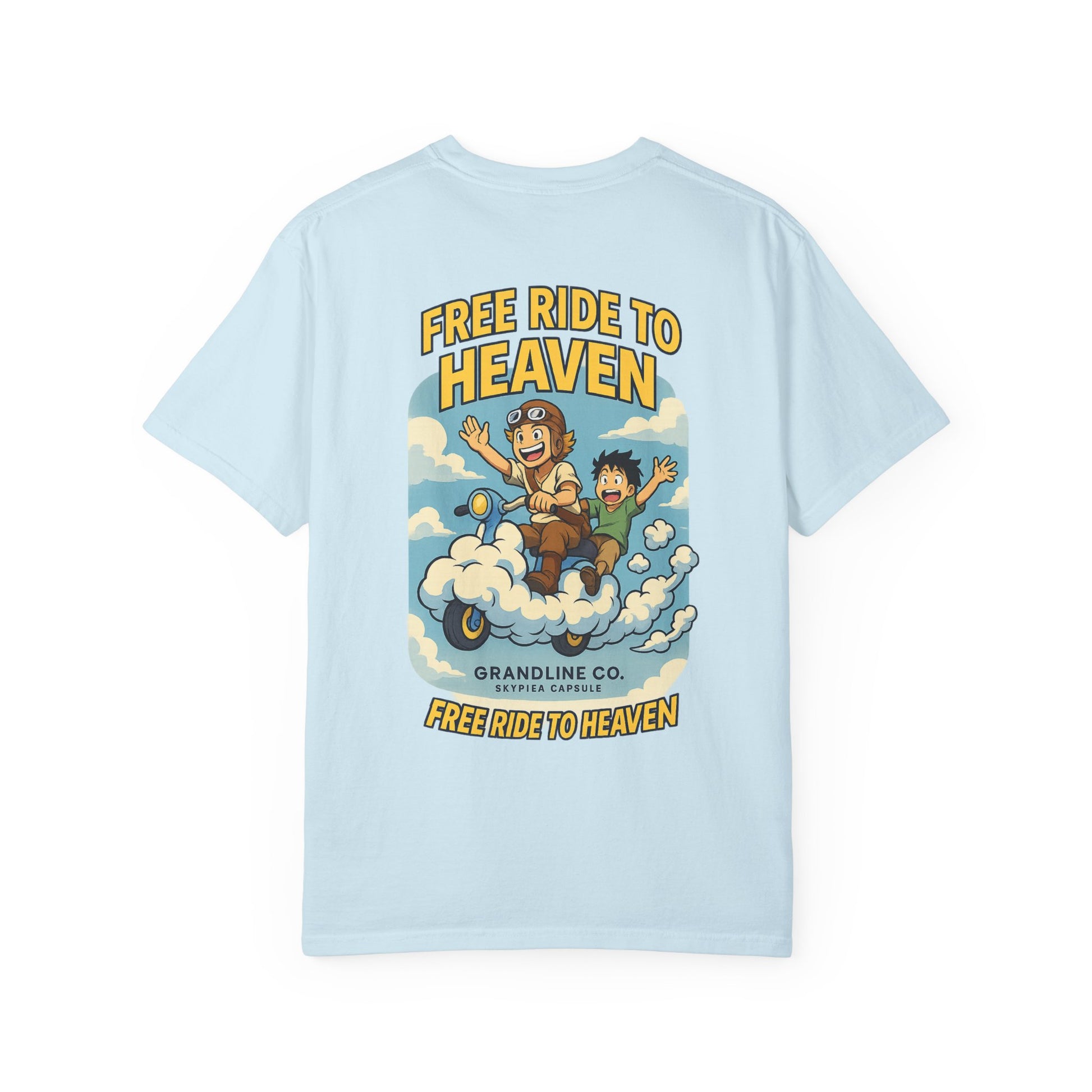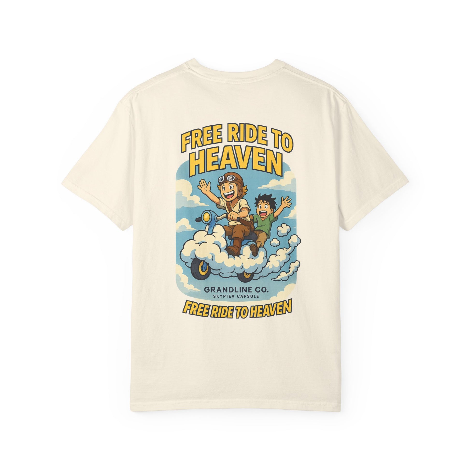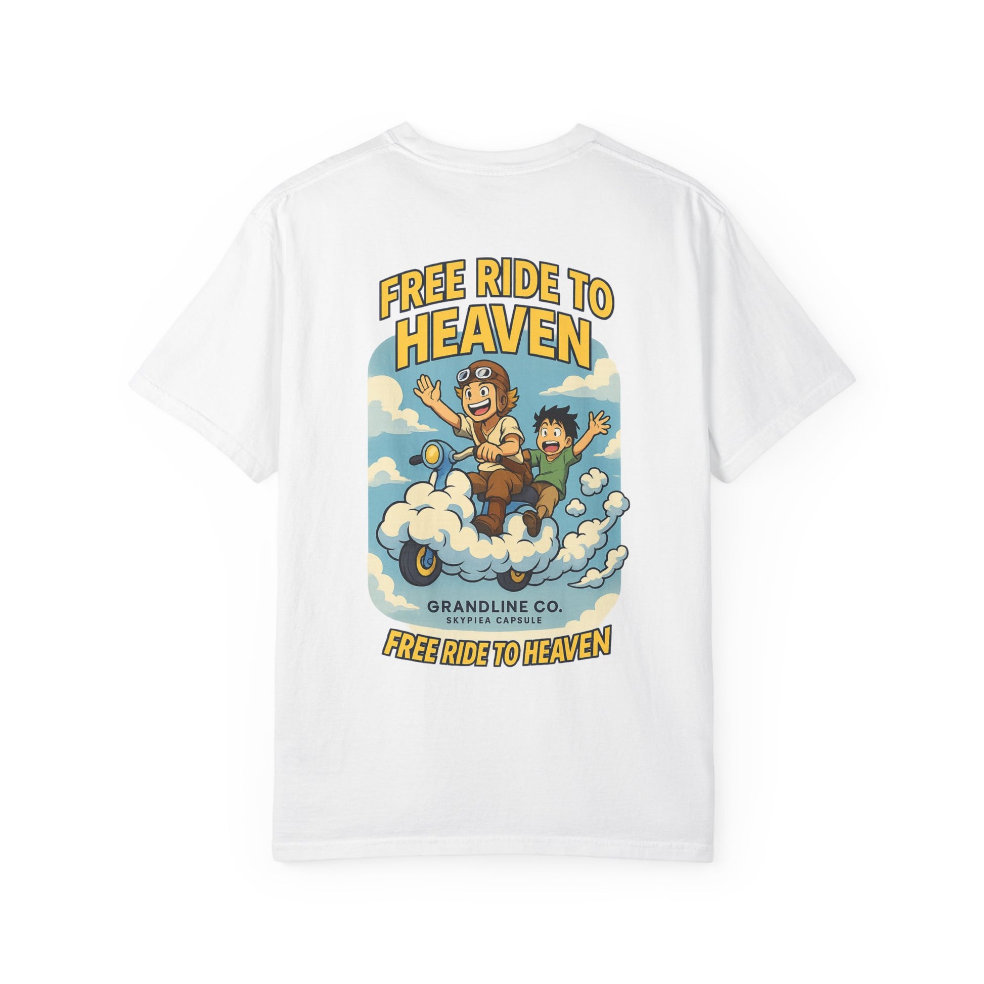 Back Design: Full anime-style cloud scooter ride with two riders, slogan “FREE RIDE TO HEAVEN.”