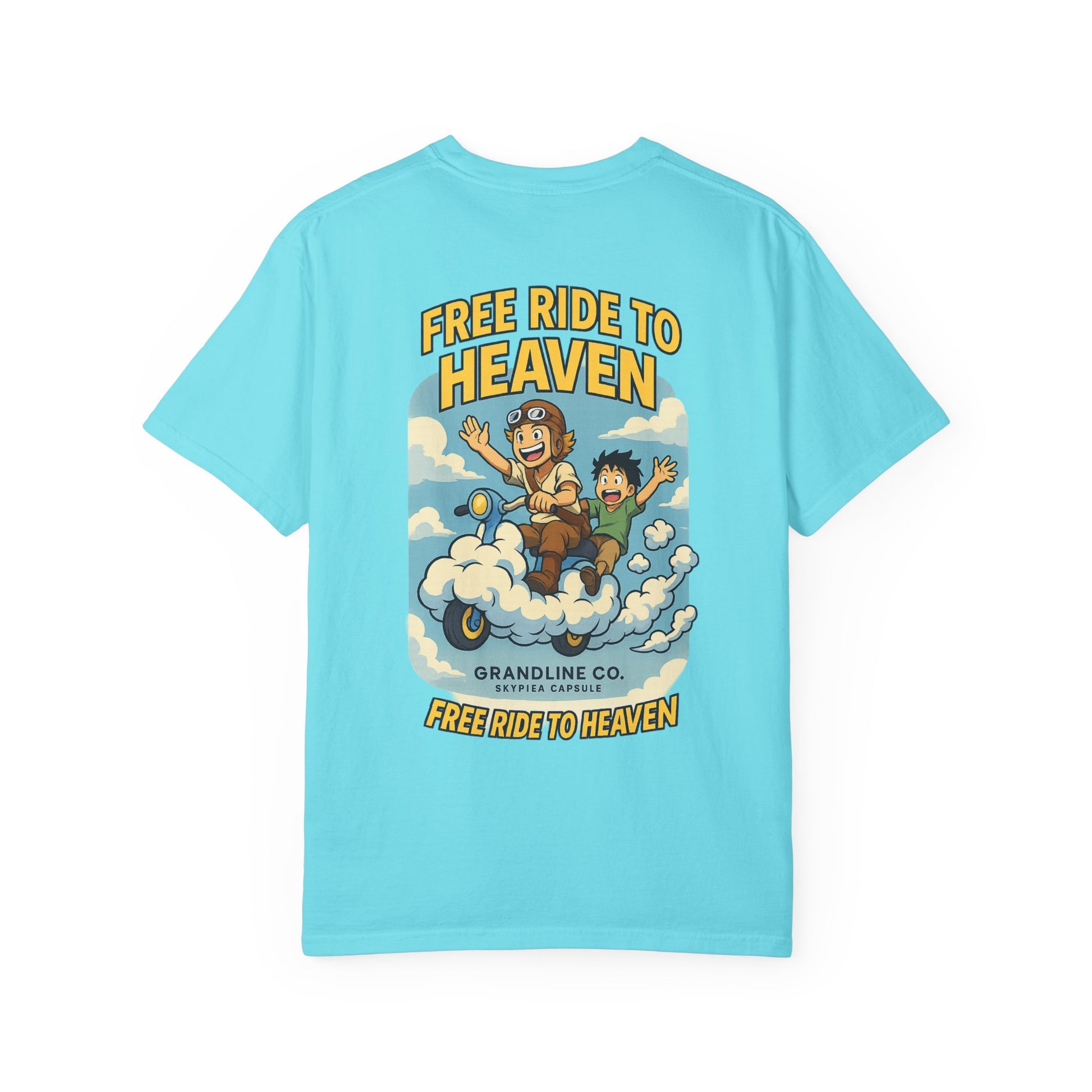 Printed on the Comfort Colors 1717 Garment-Dyed Tee, this shirt balances humor and hype — parodying everyday life while celebrating the absurd wonder of Skypiea.
