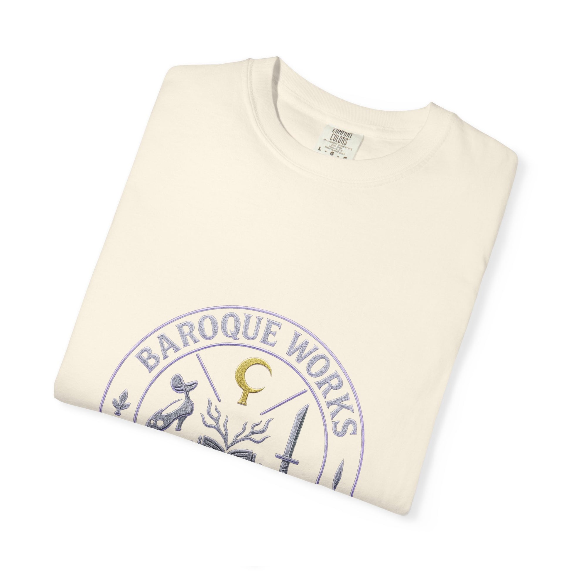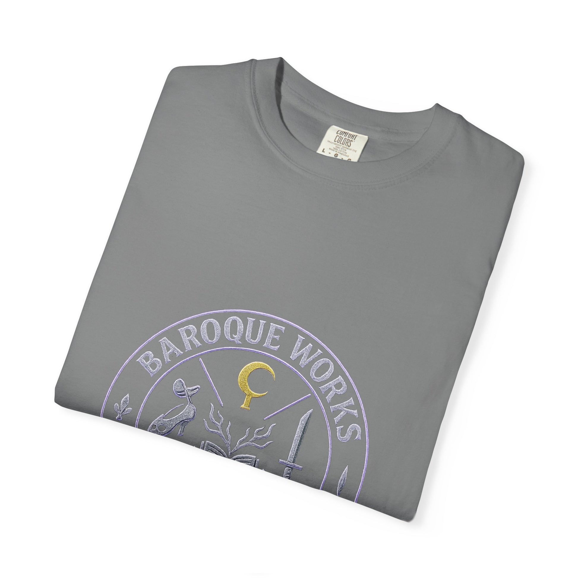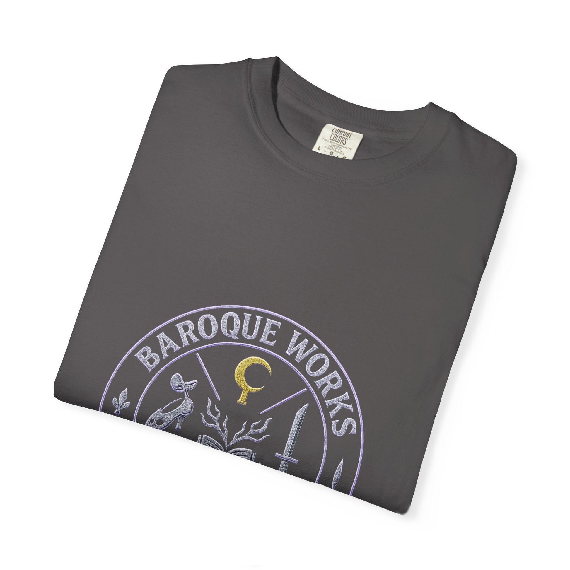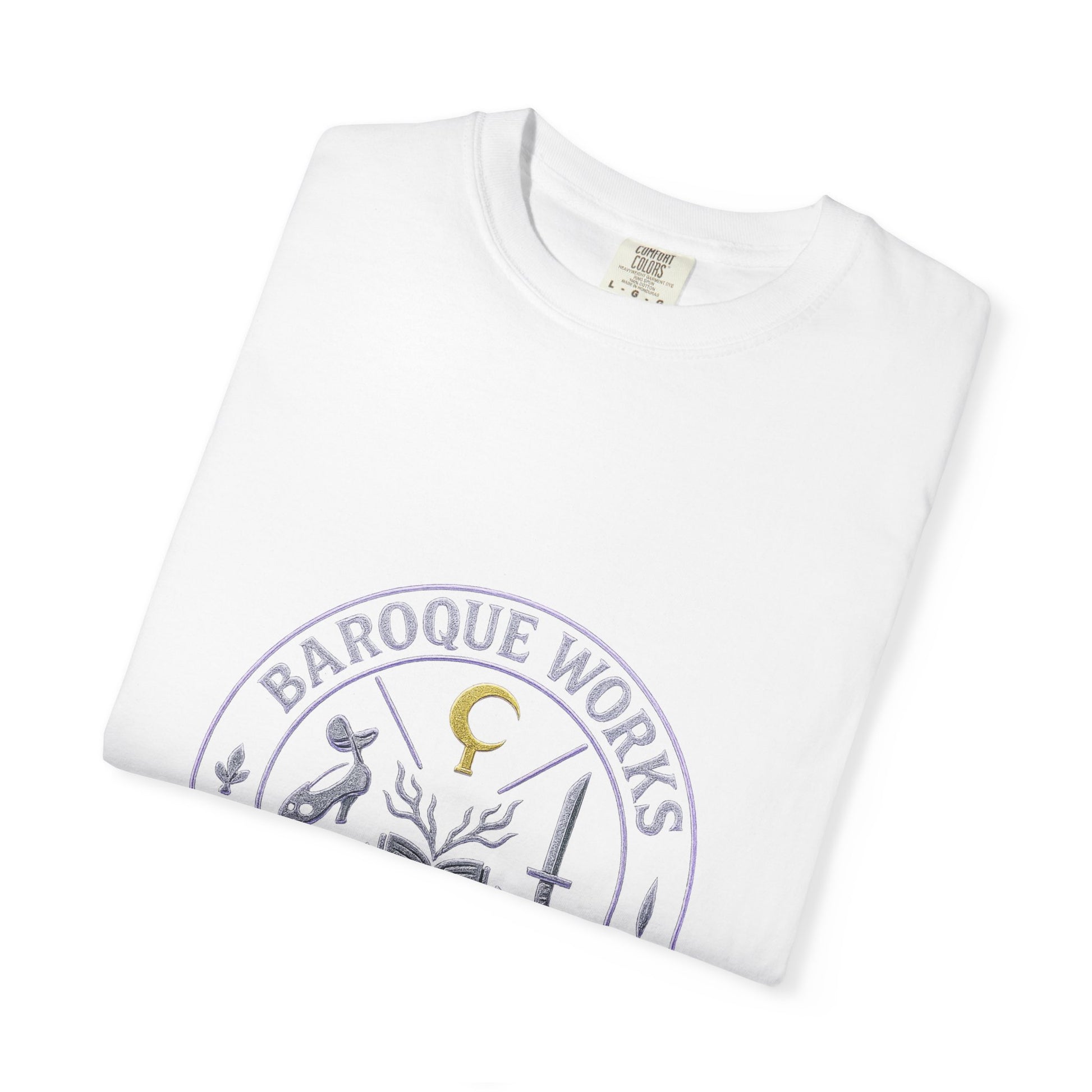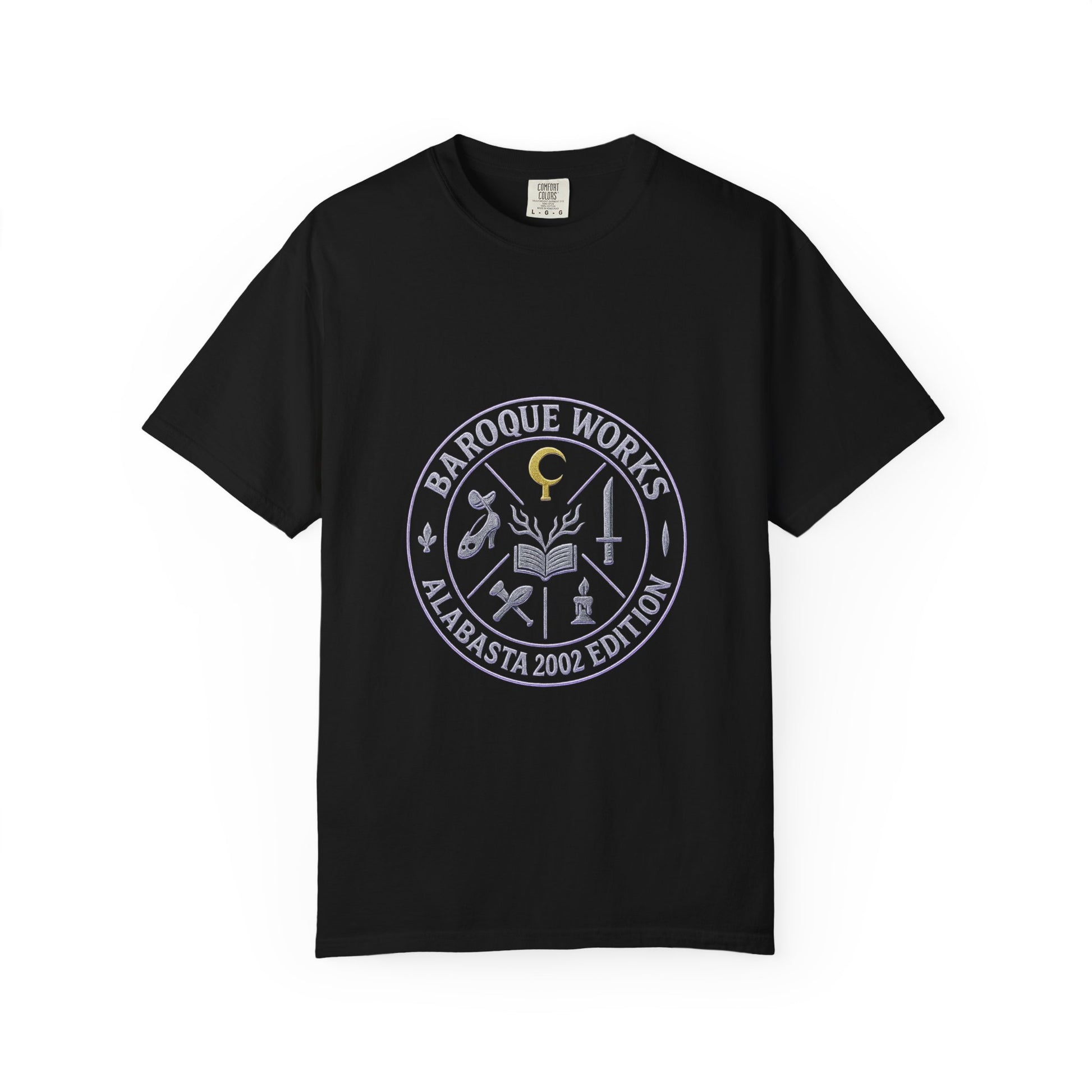 “Dance of Baroque” embodies the flamboyance and danger of Alabasta’s most eccentric villains. The front design presents a mafia-style crest, a circular emblem that encodes the syndicate’s power through symbols: Mr. 0’s golden hook, Mr. 1’s blade, Mr. 2’s slipper and mask, Mr. 3’s dripping candle, Mr. 4’s bat and pawprint, and Miss All Sunday’s open book with sprouting arms. Framed by the words Baroque Works – Alabasta 2002 Edition, the emblem glows in distressed chrome and neon purple, like a secret society seal.