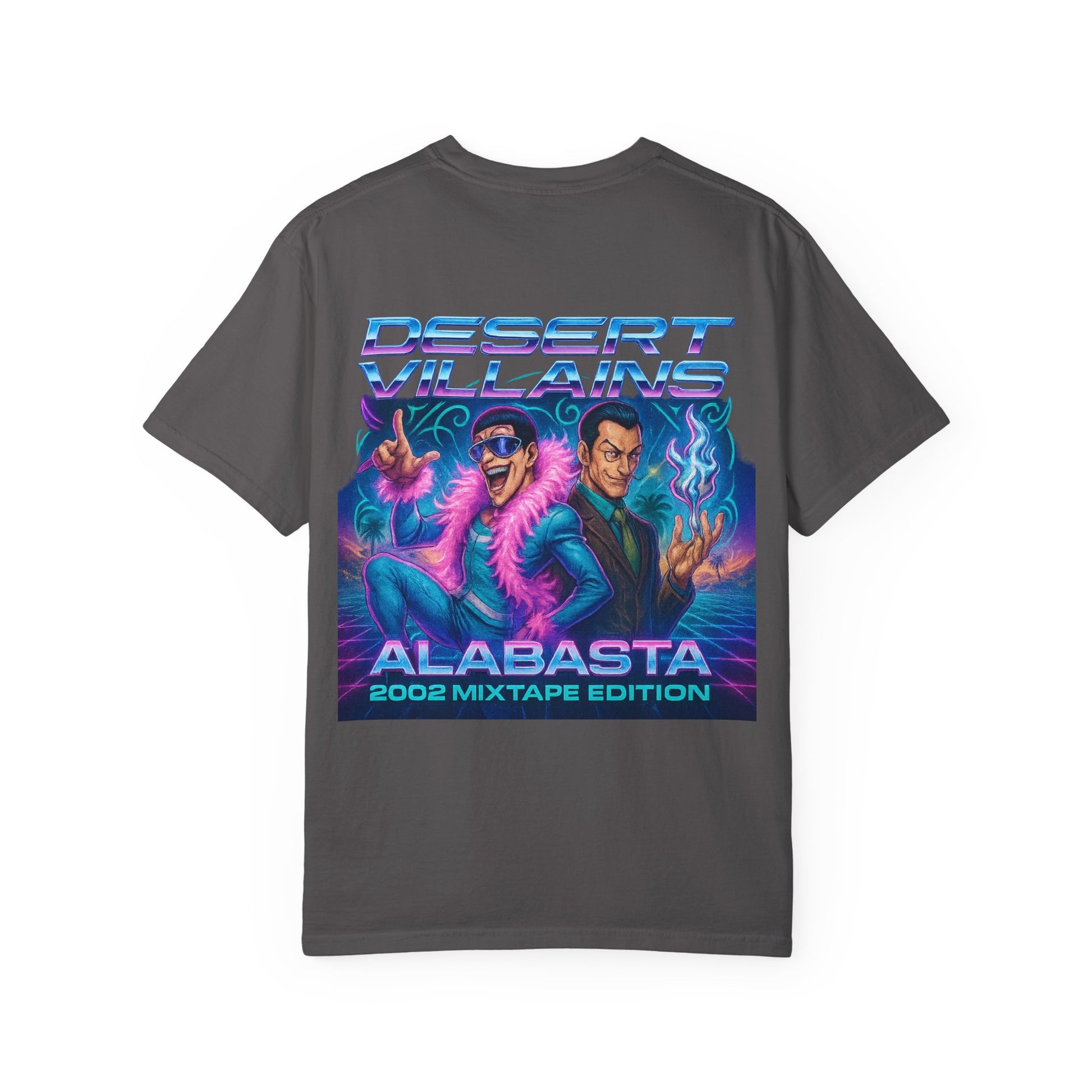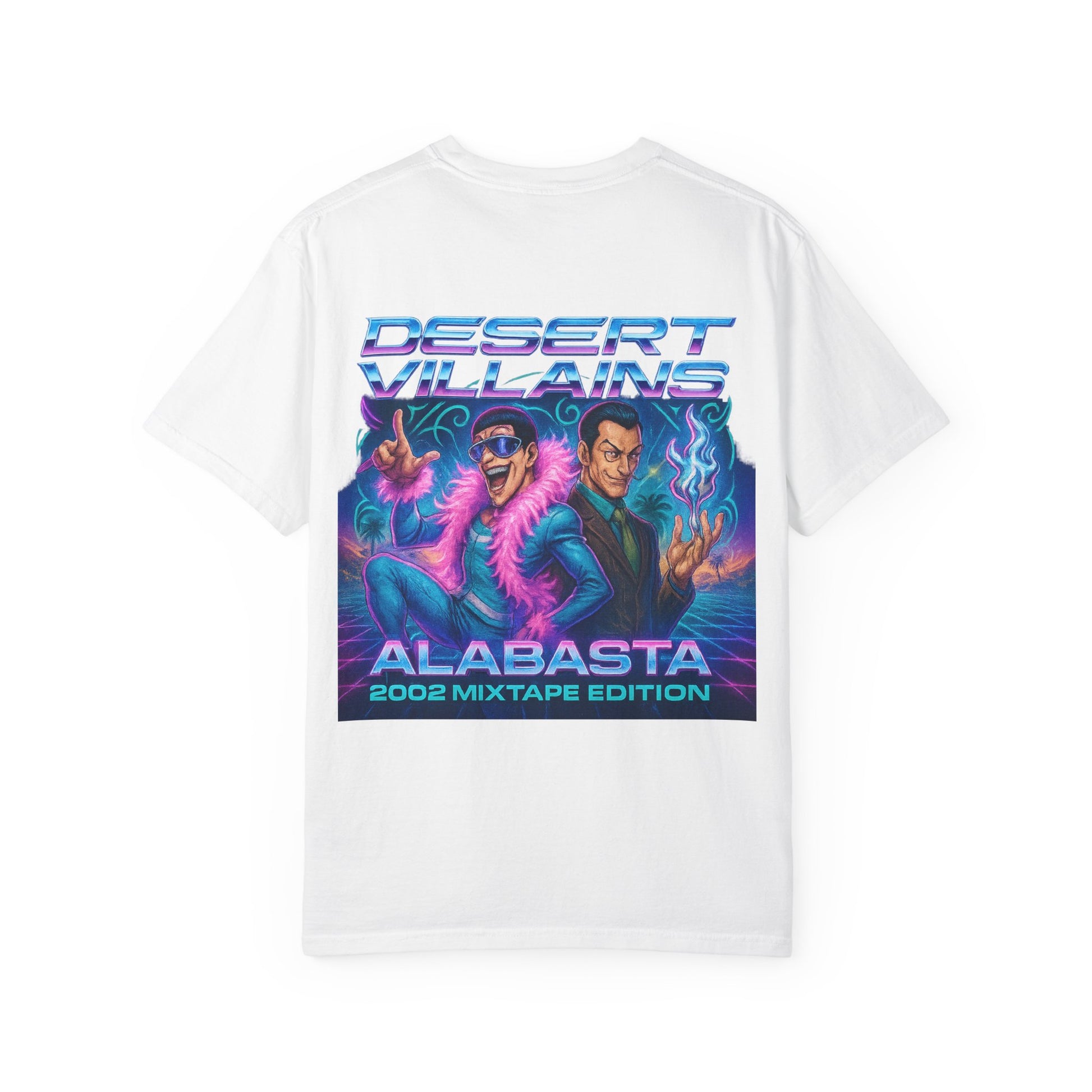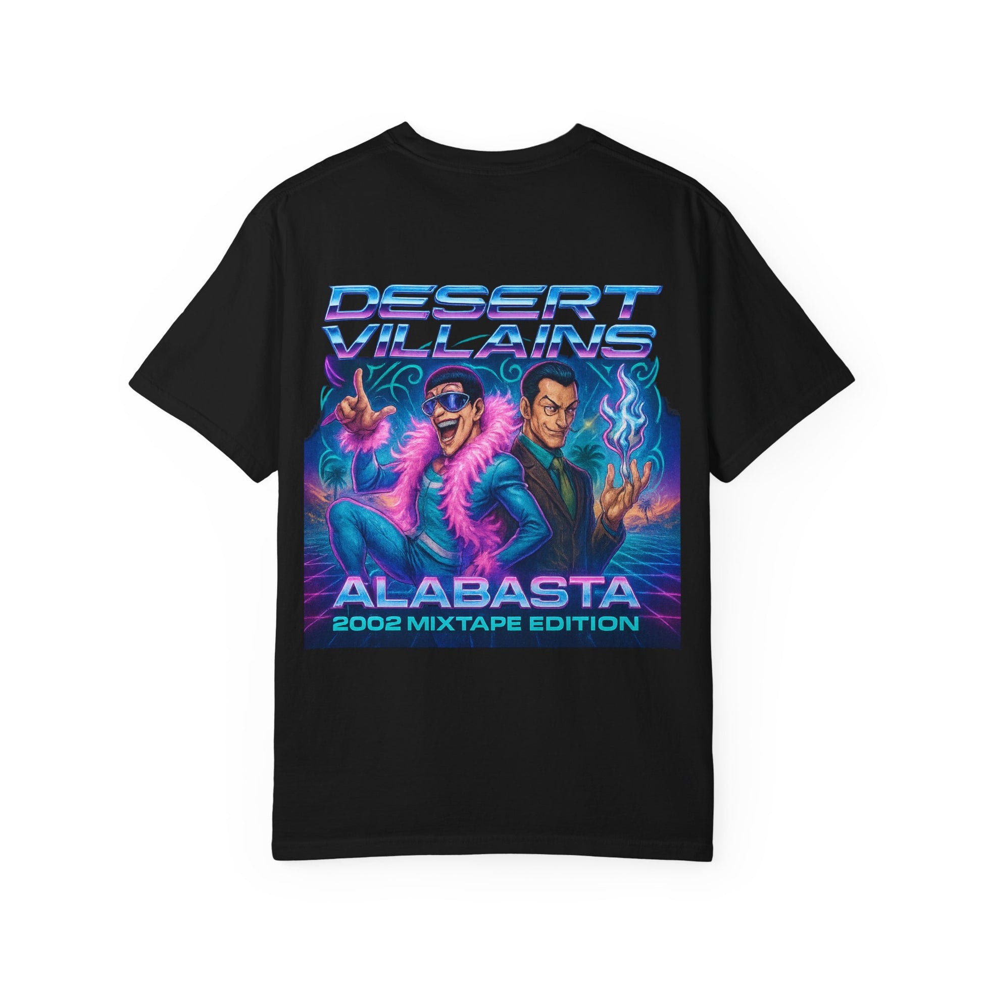 The back unleashes the chaos with a full Y2K mixtape poster. Mr. 2 and Mr. 0 take center stage, styled in neon gradients and retro flair beneath the banner Desert Villains – Alabasta 2002 Mixtape Edition. With palm trees, vaporwave grids, and blazing lights, the graphic celebrates the camp spectacle of Baroque Works as if they were headliners on a desert nightclub flyer.