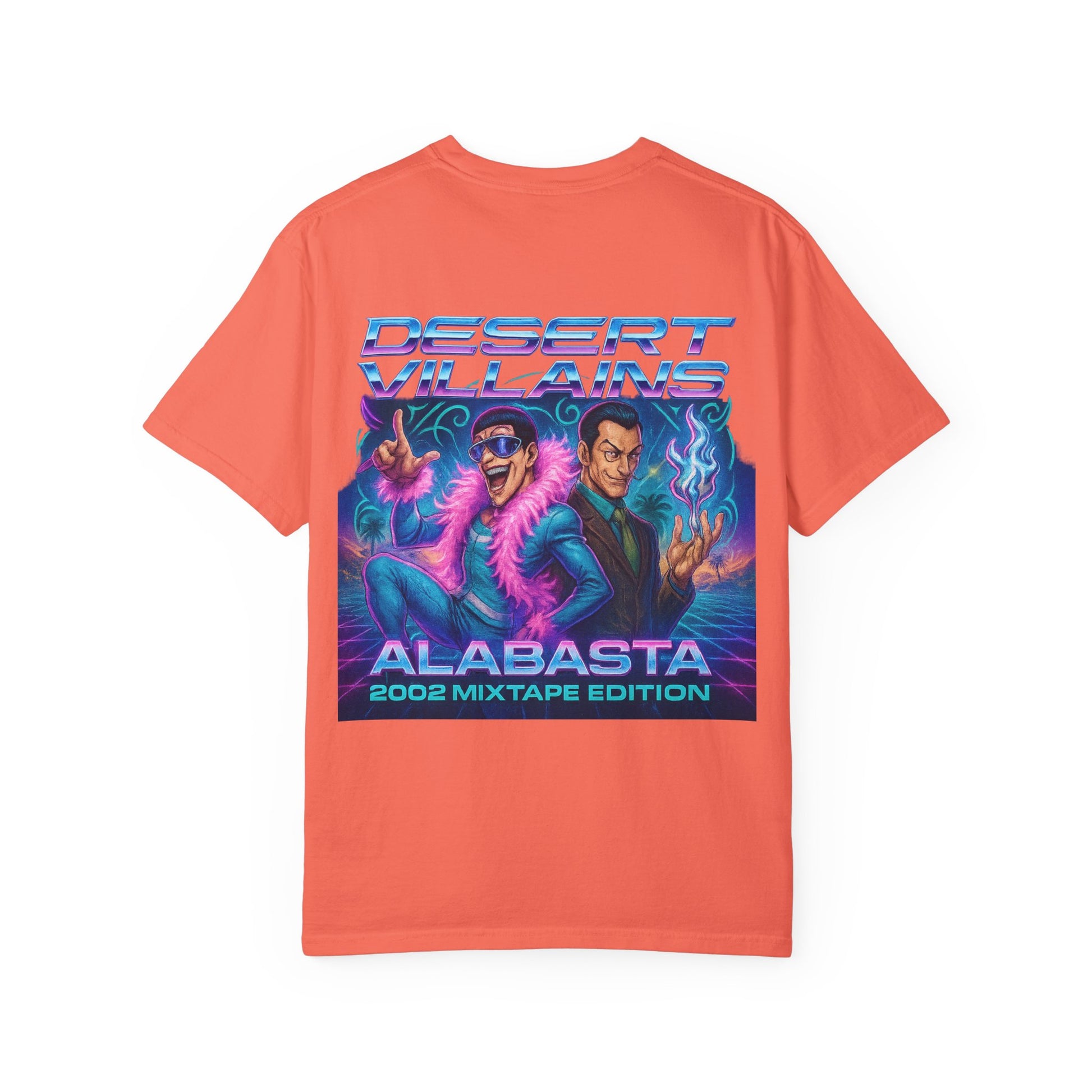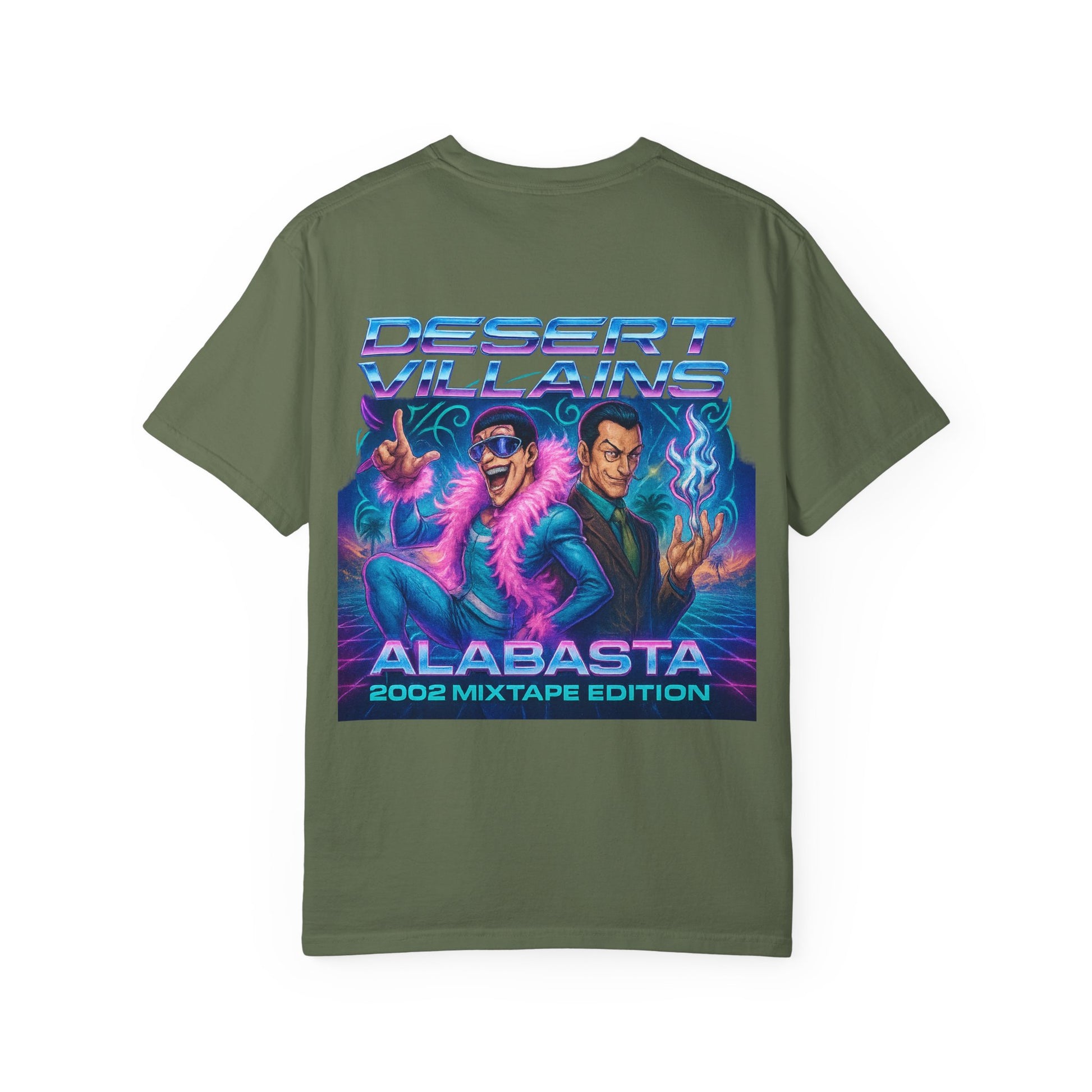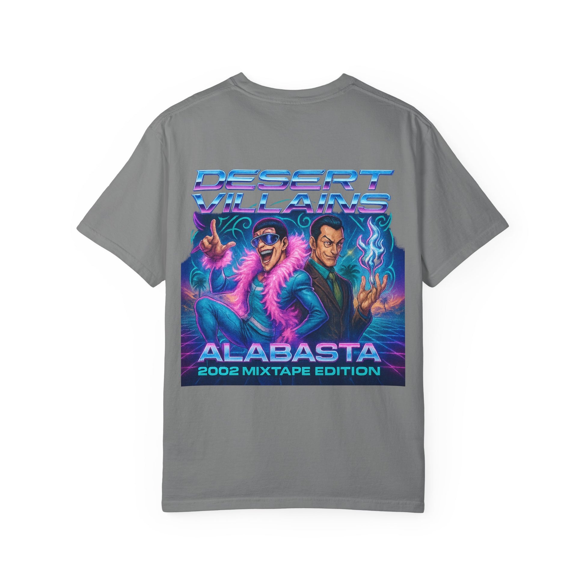 The back unleashes the chaos with a full Y2K mixtape poster. Mr. 2 and Mr. 0 take center stage, styled in neon gradients and retro flair beneath the banner Desert Villains – Alabasta 2002 Mixtape Edition. With palm trees, vaporwave grids, and blazing lights, the graphic celebrates the camp spectacle of Baroque Works as if they were headliners on a desert nightclub flyer.