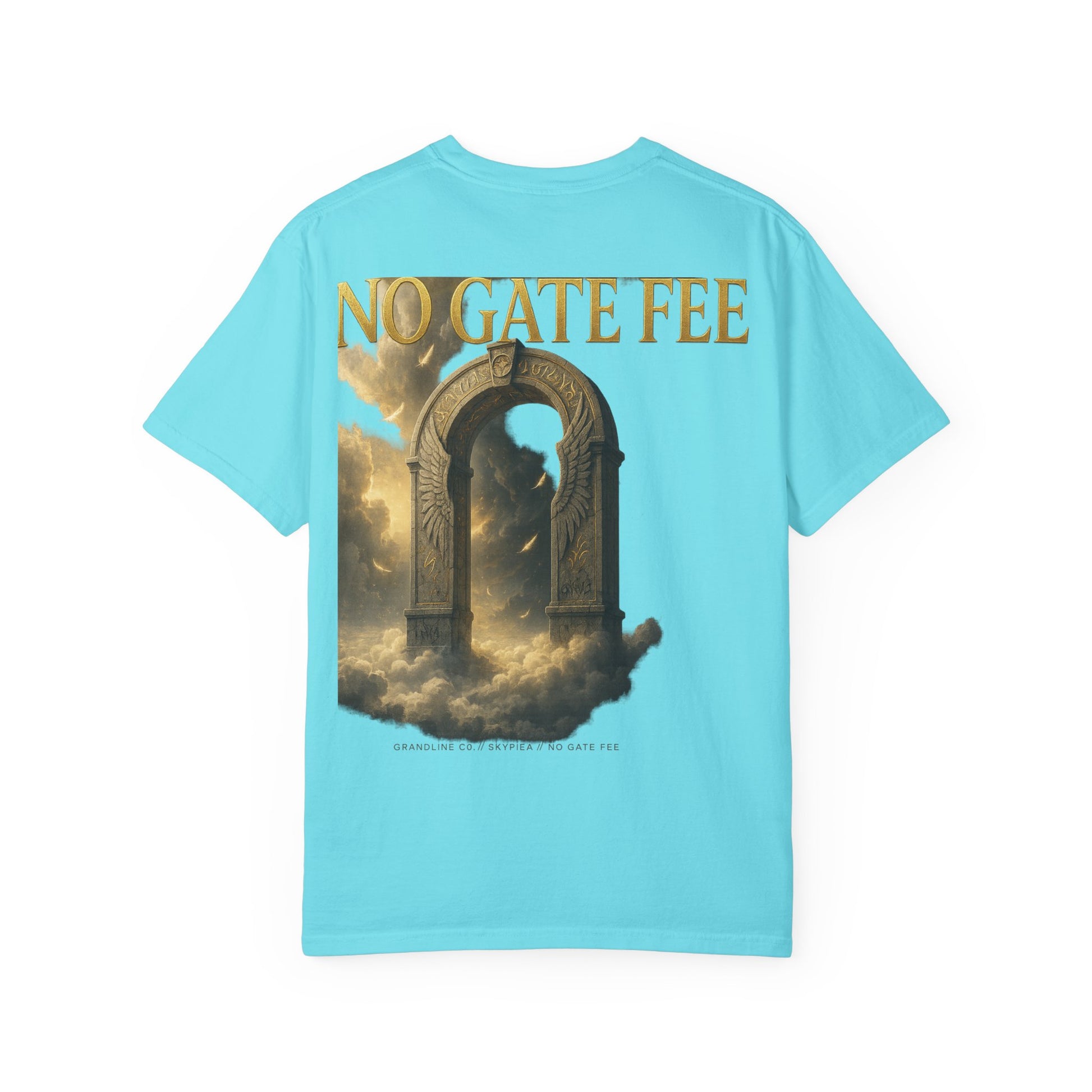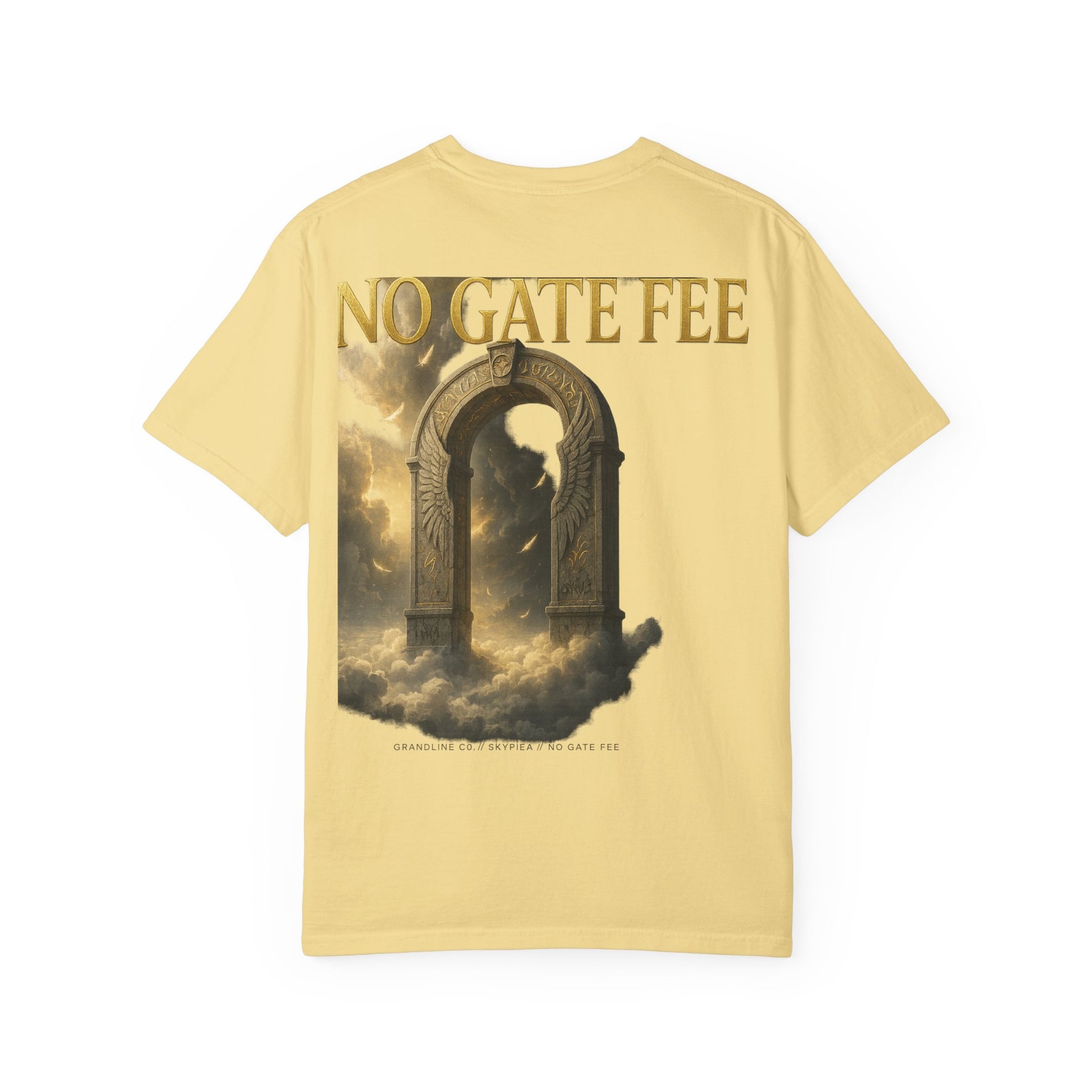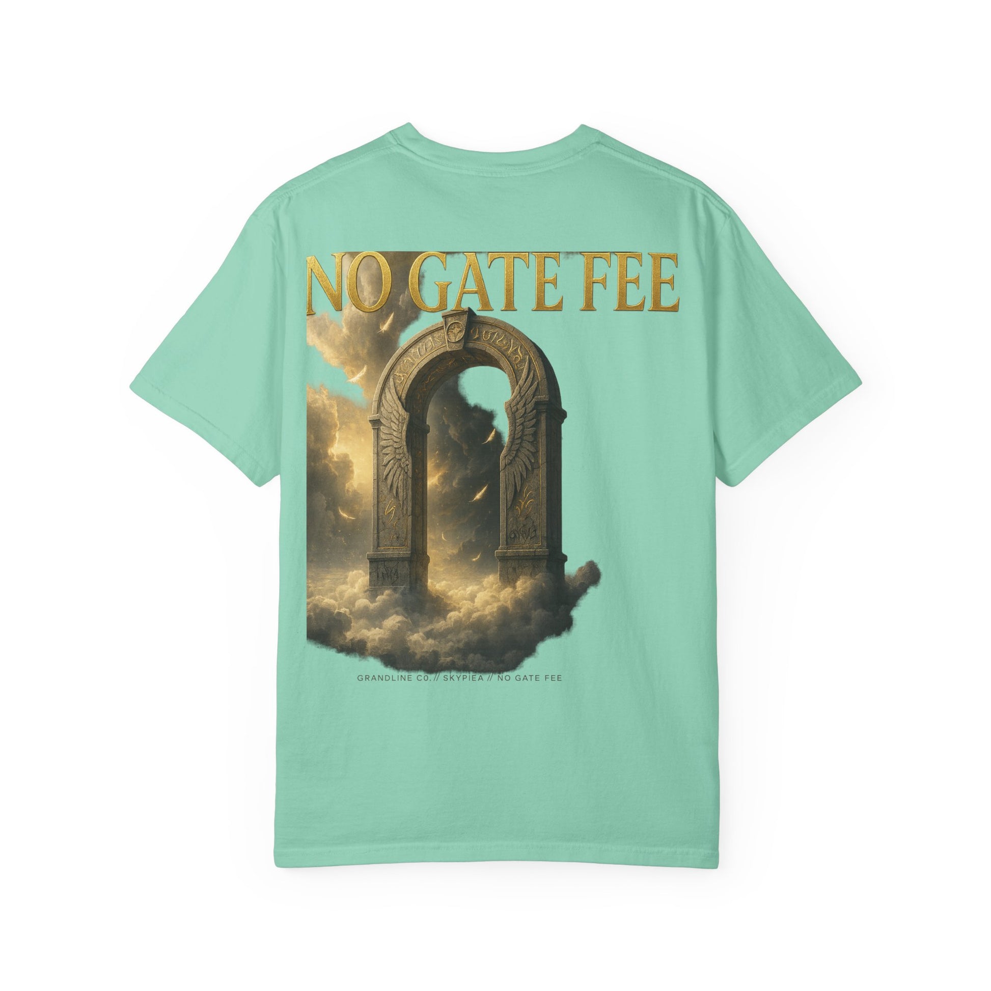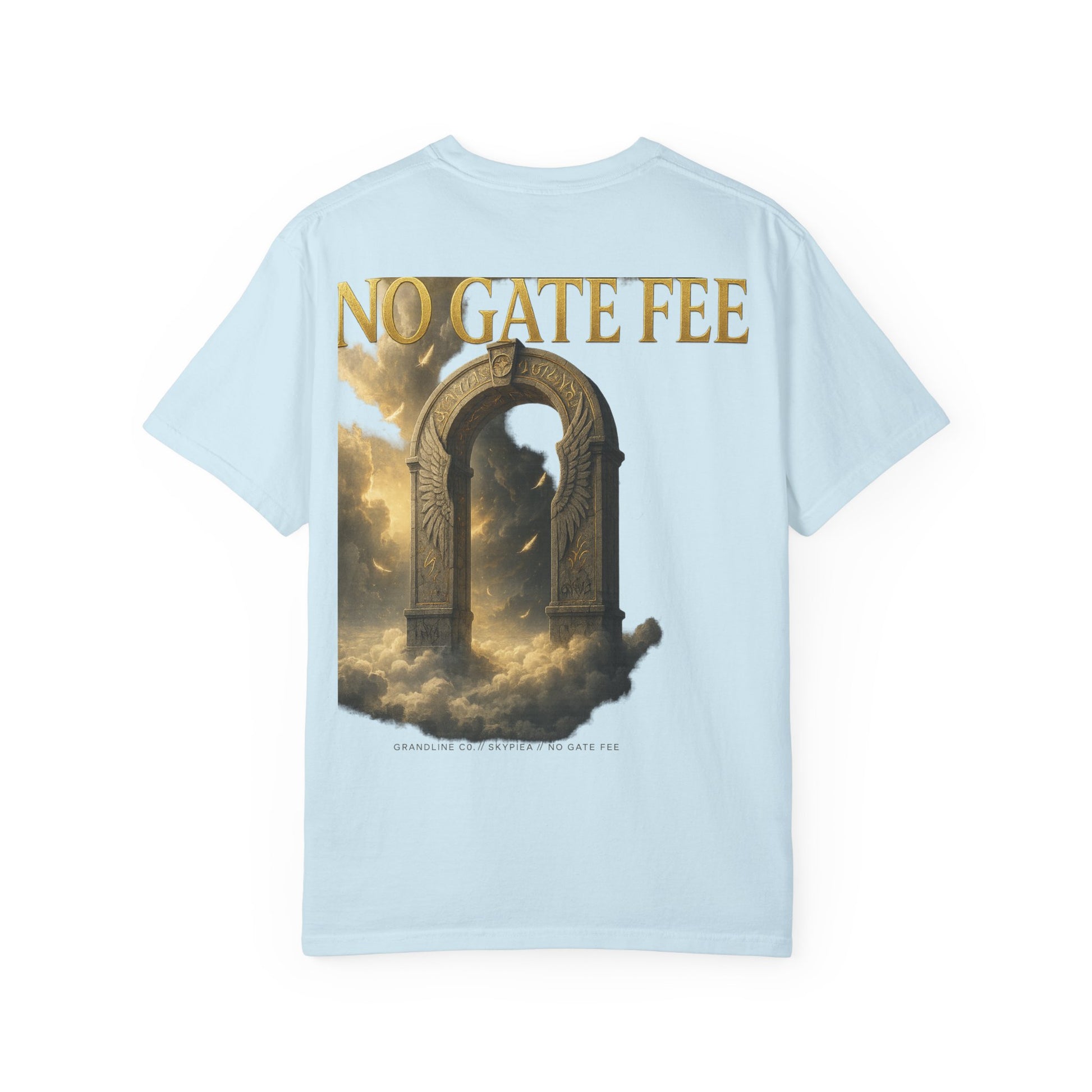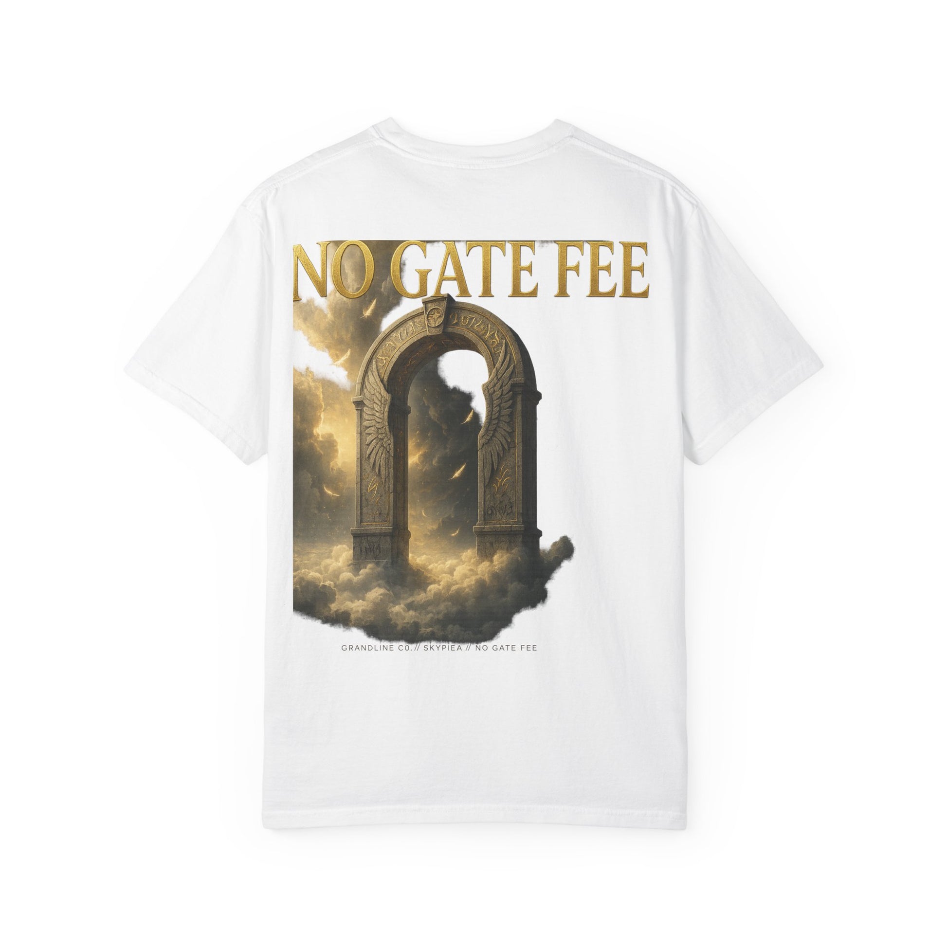 The back design features a monumental stone arch floating above a sea of clouds, carved with angel wings and glowing runes. Feathers drift through cinematic golden light, while bold royal text declares: “NO GATE FEE” — a rebellious nod to the tolls of Skypiea. Hidden within the cracks are layered Easter eggs: faint graffiti reading Grandline Co., a compass etched into the keystone, and subtle runic scripts for fans to decode.