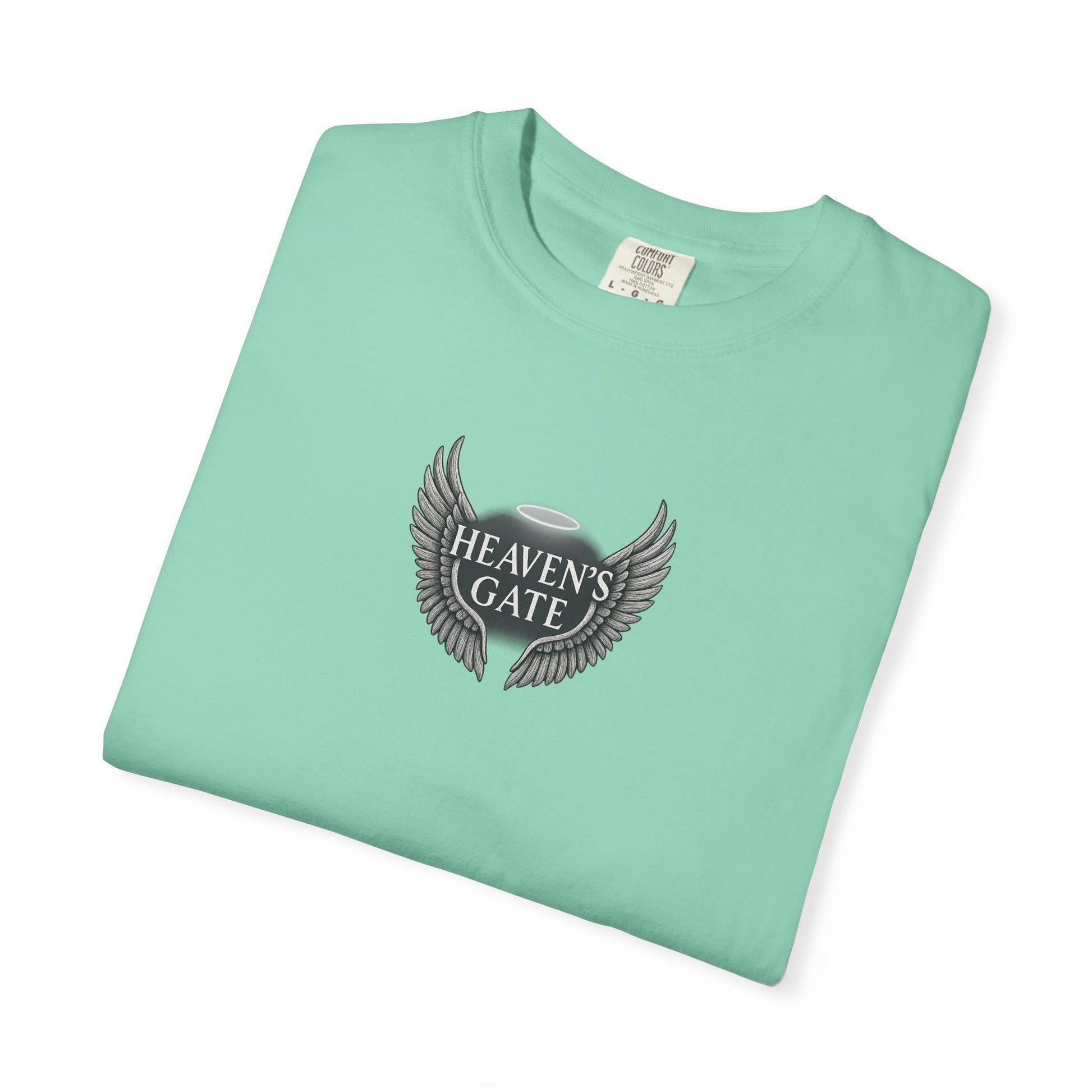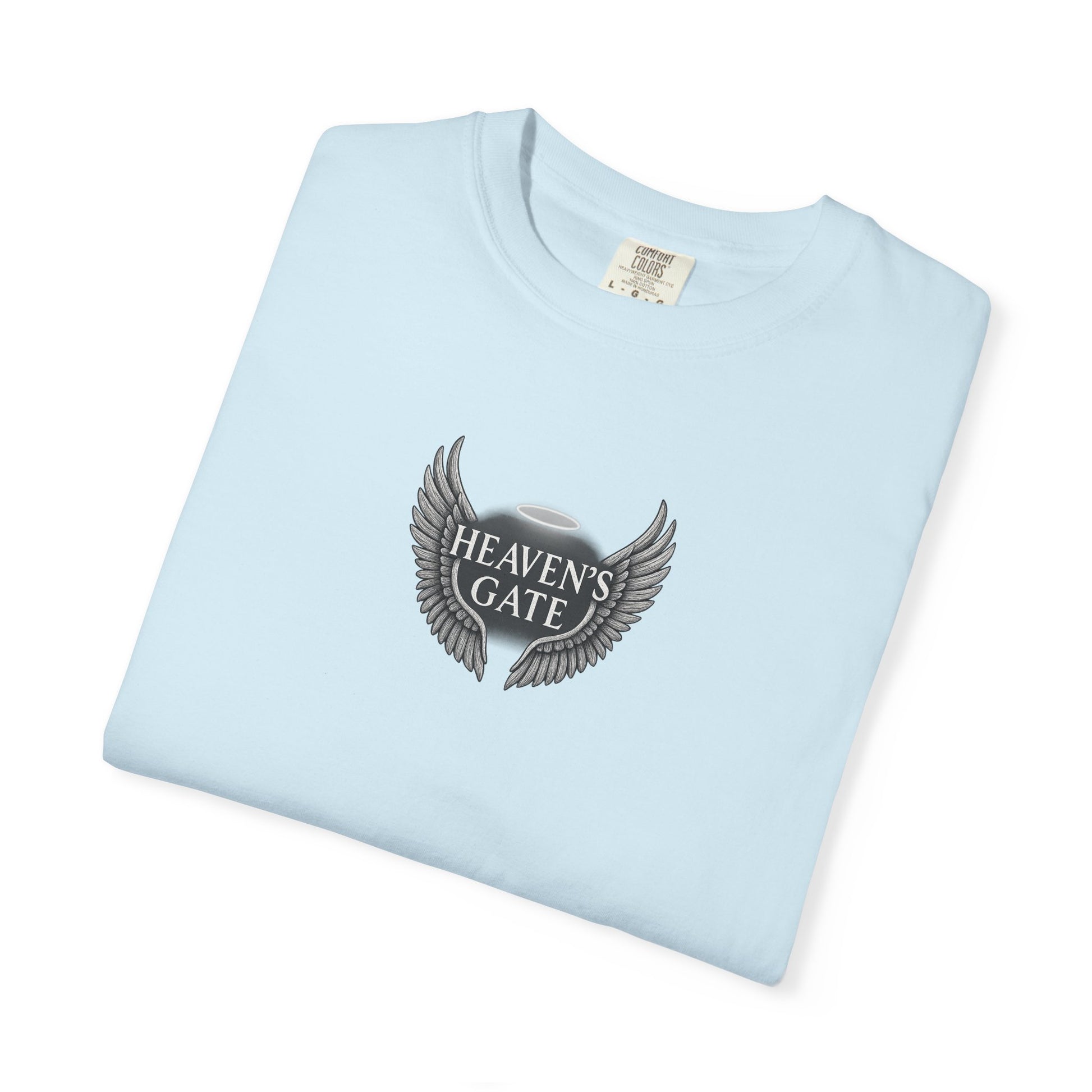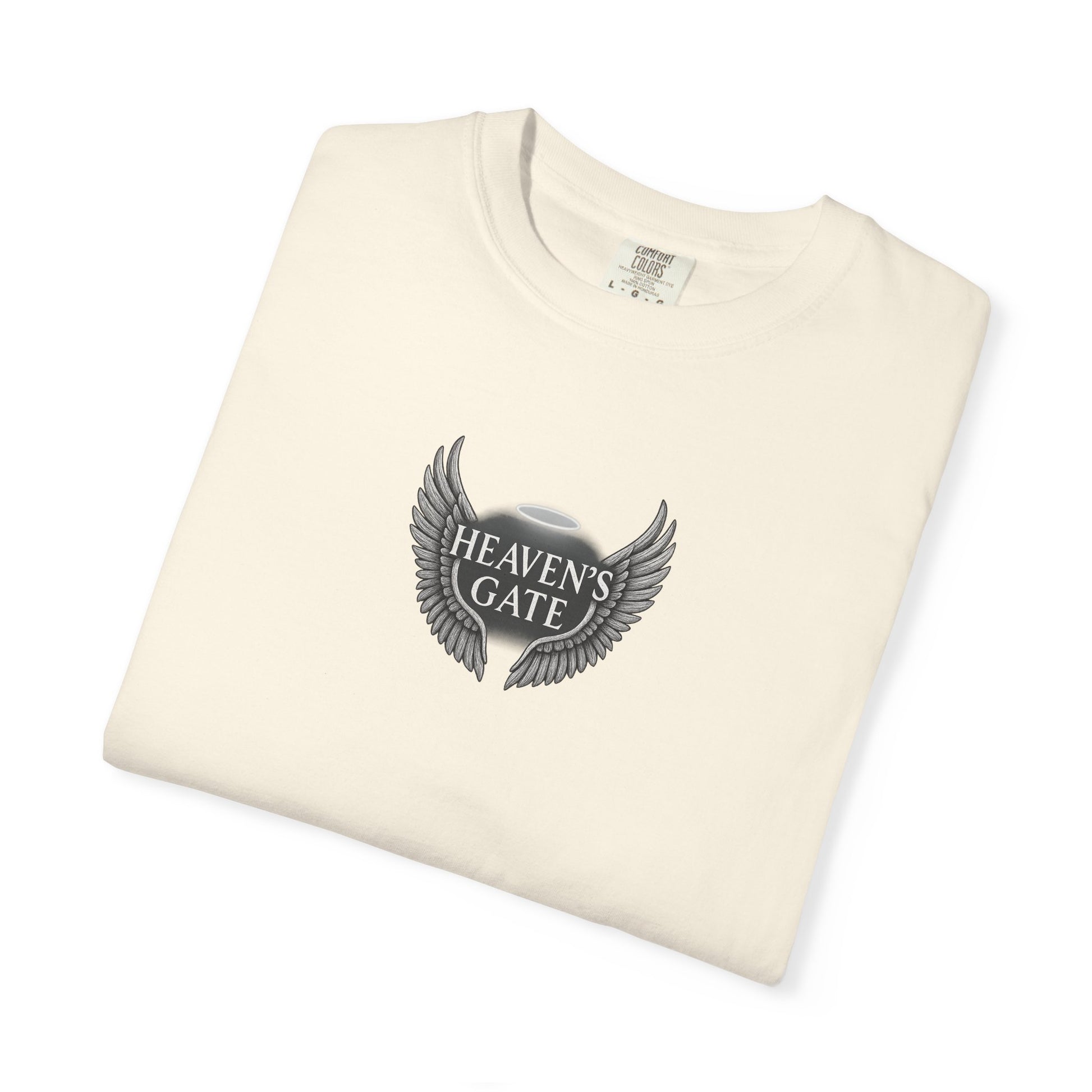 The front chest emblem balances the scale with clean minimalism — angel wings outstretched around the words Heaven’s Gate, topped by a halo, glowing faintly like a divine streetwear logo.