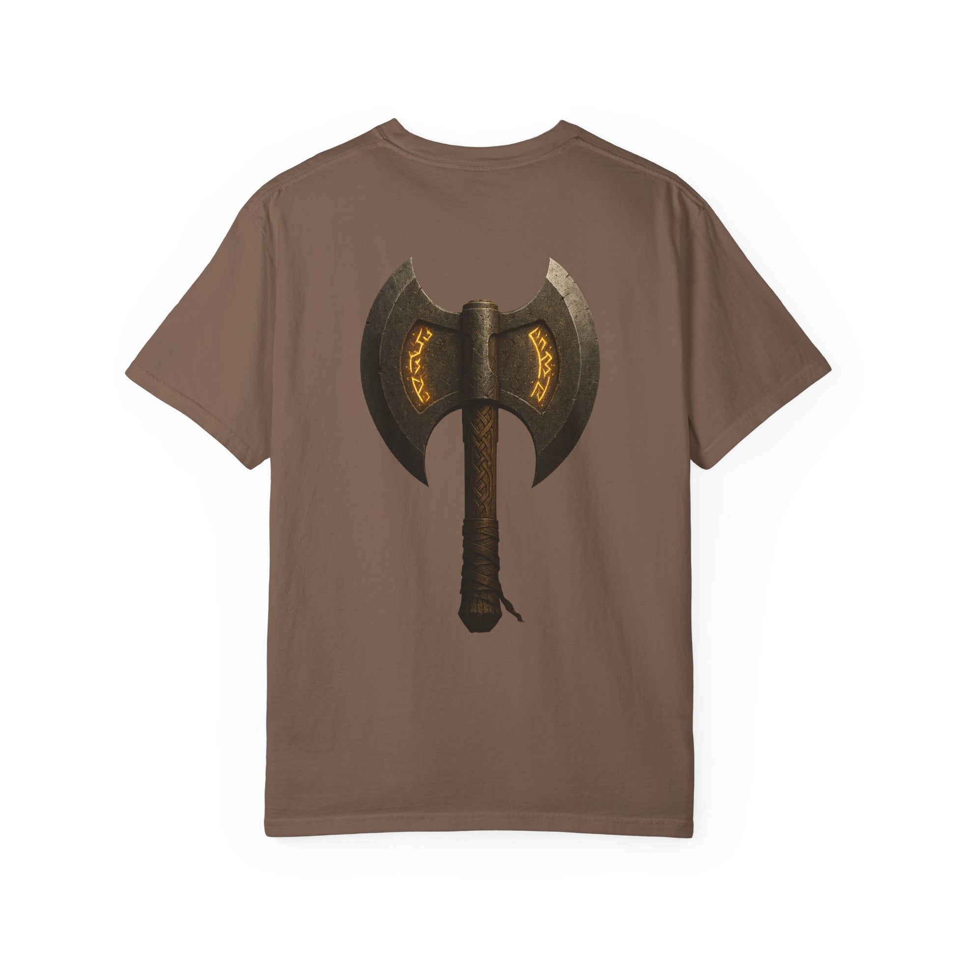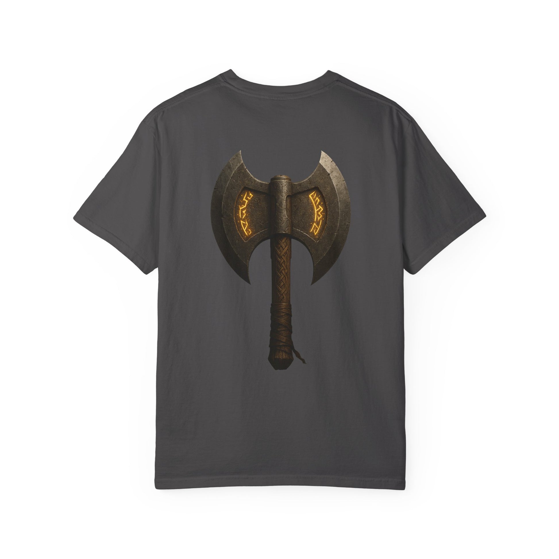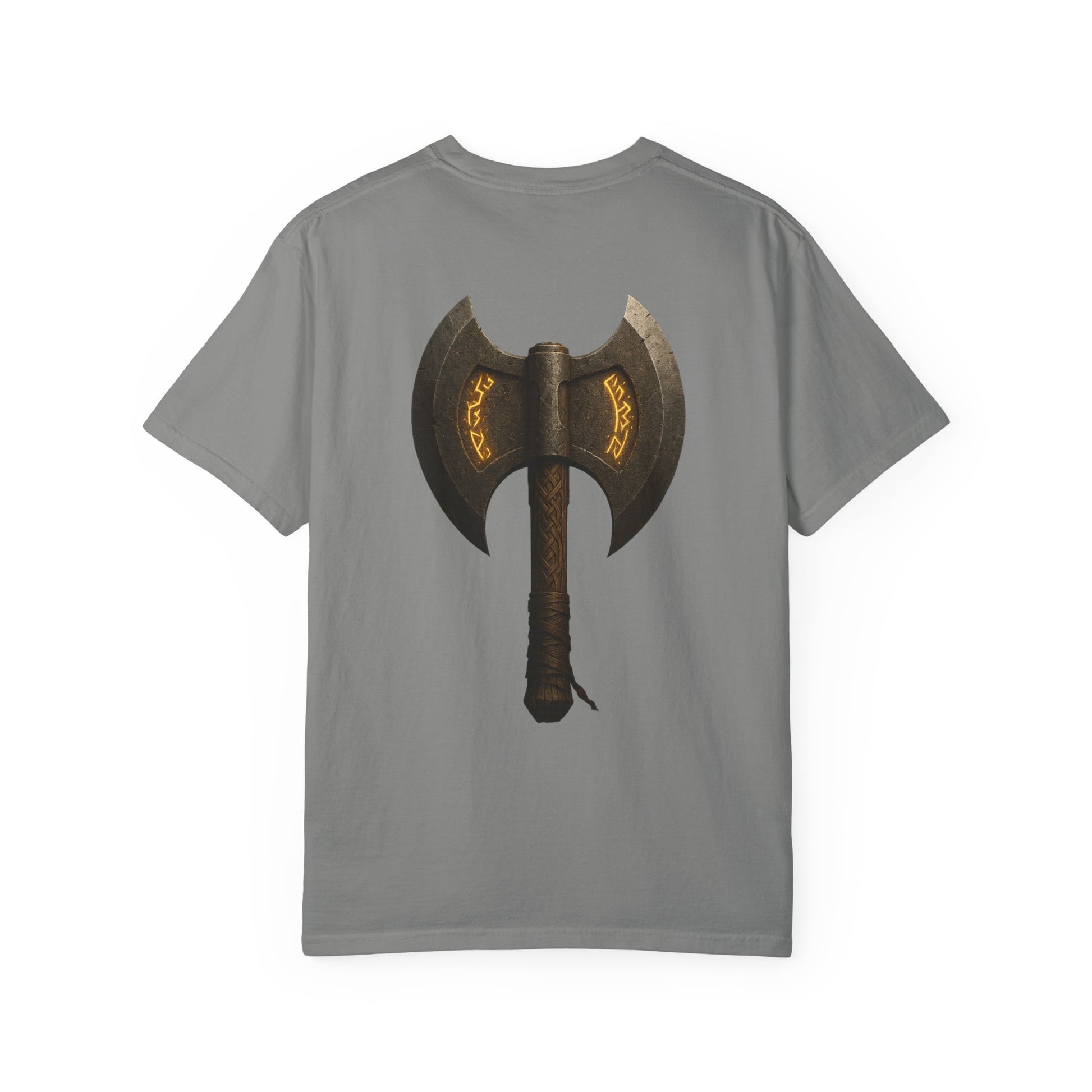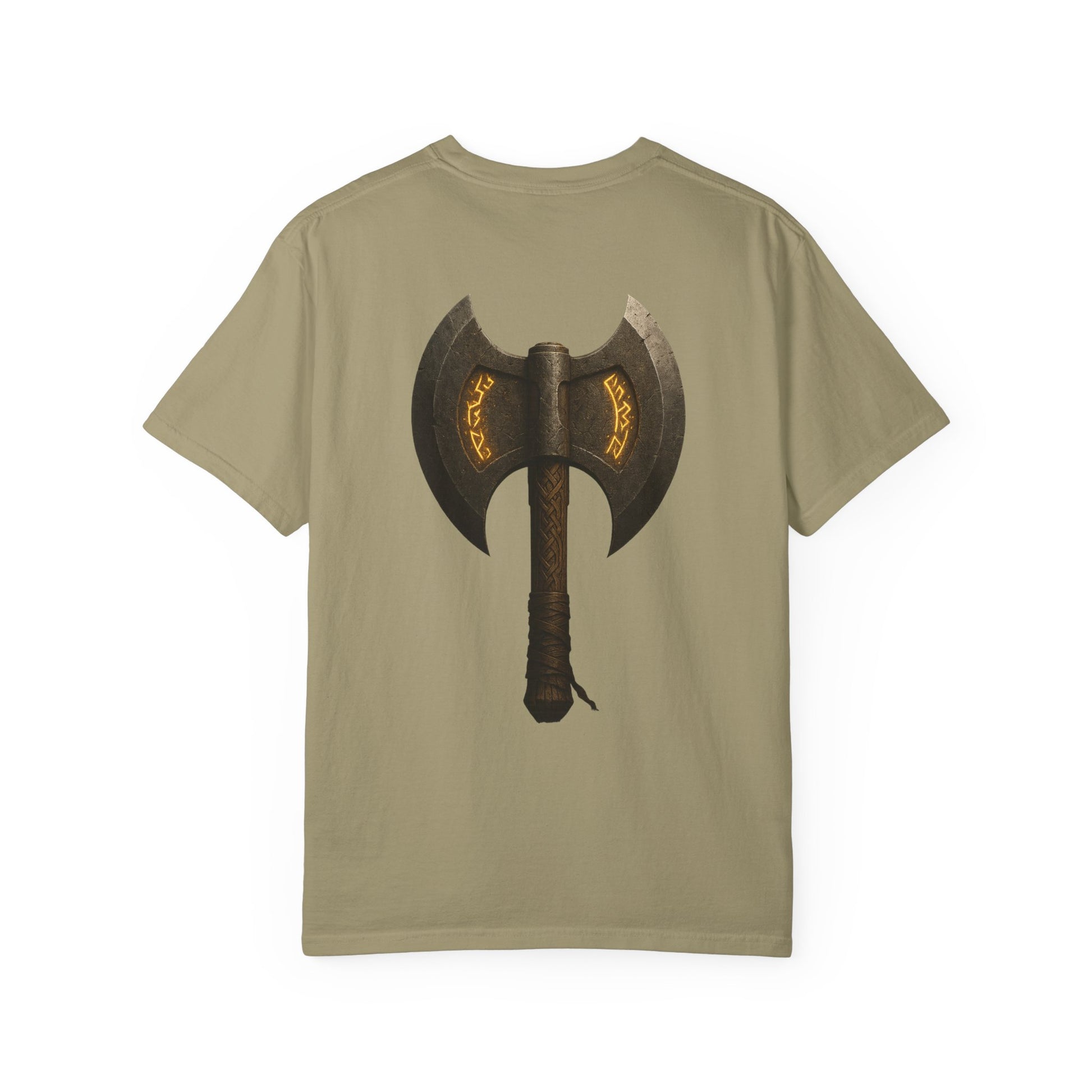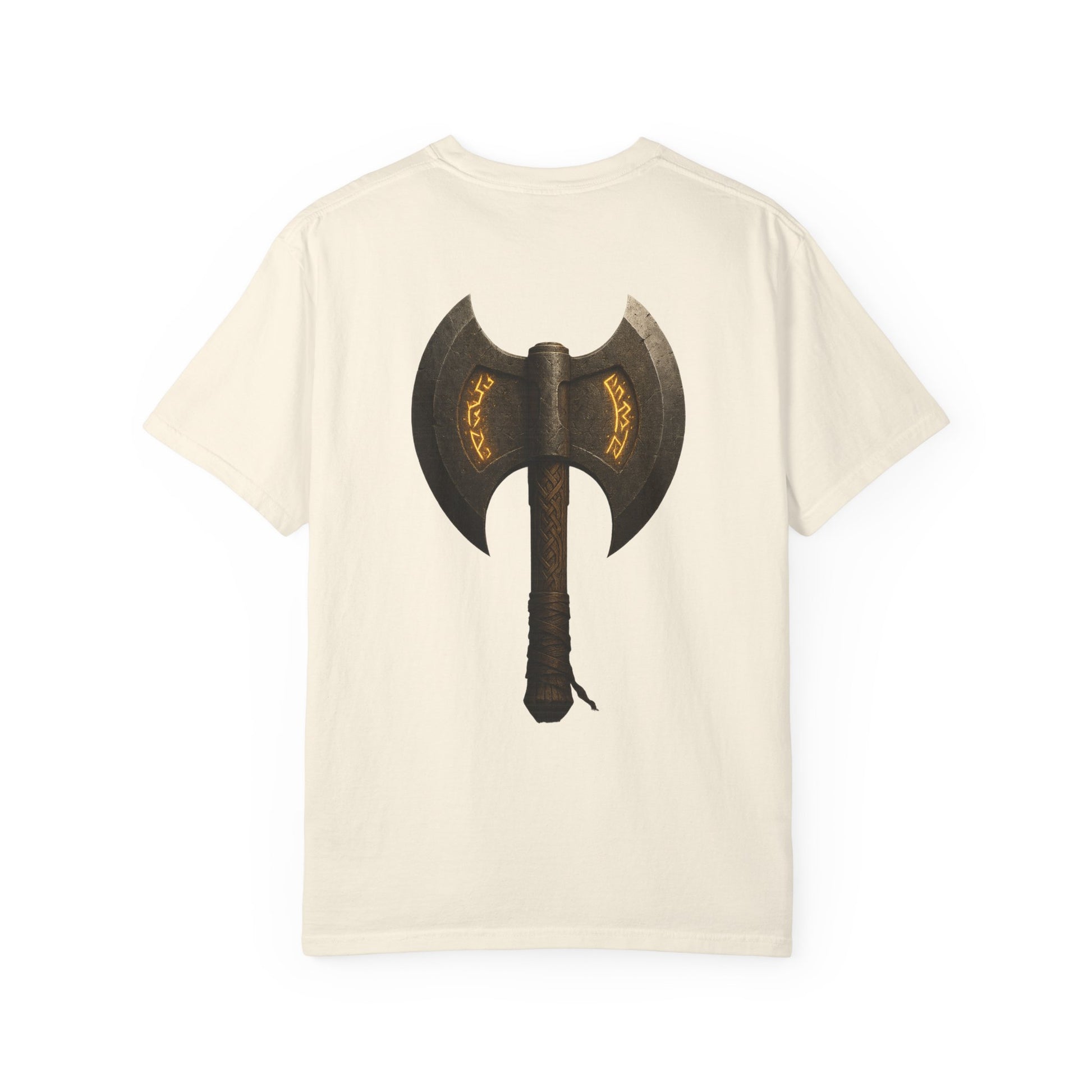“Colossus’ Oath” embodies the mythic might of Elbaf’s giants through Loki’s twin axes. The front graphic presents one weapon in hyper-realistic detail, its glowing runes radiating ancient power. The back mirrors its twin, completing the set — as if the wearer shoulders the burden of a warrior’s arsenal. Knotwork engravings, stone-etched cracks, and fiery runes give the shirt a battle-forged authenticity. This piece feels less like clothing and more like an heirloom — a tribute to the awakening of giant kings.