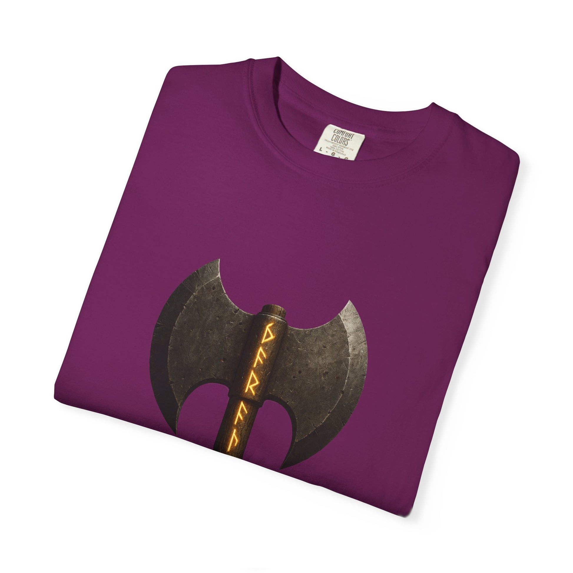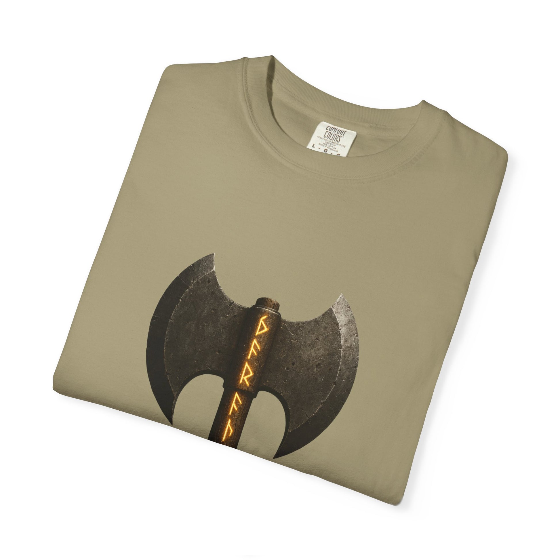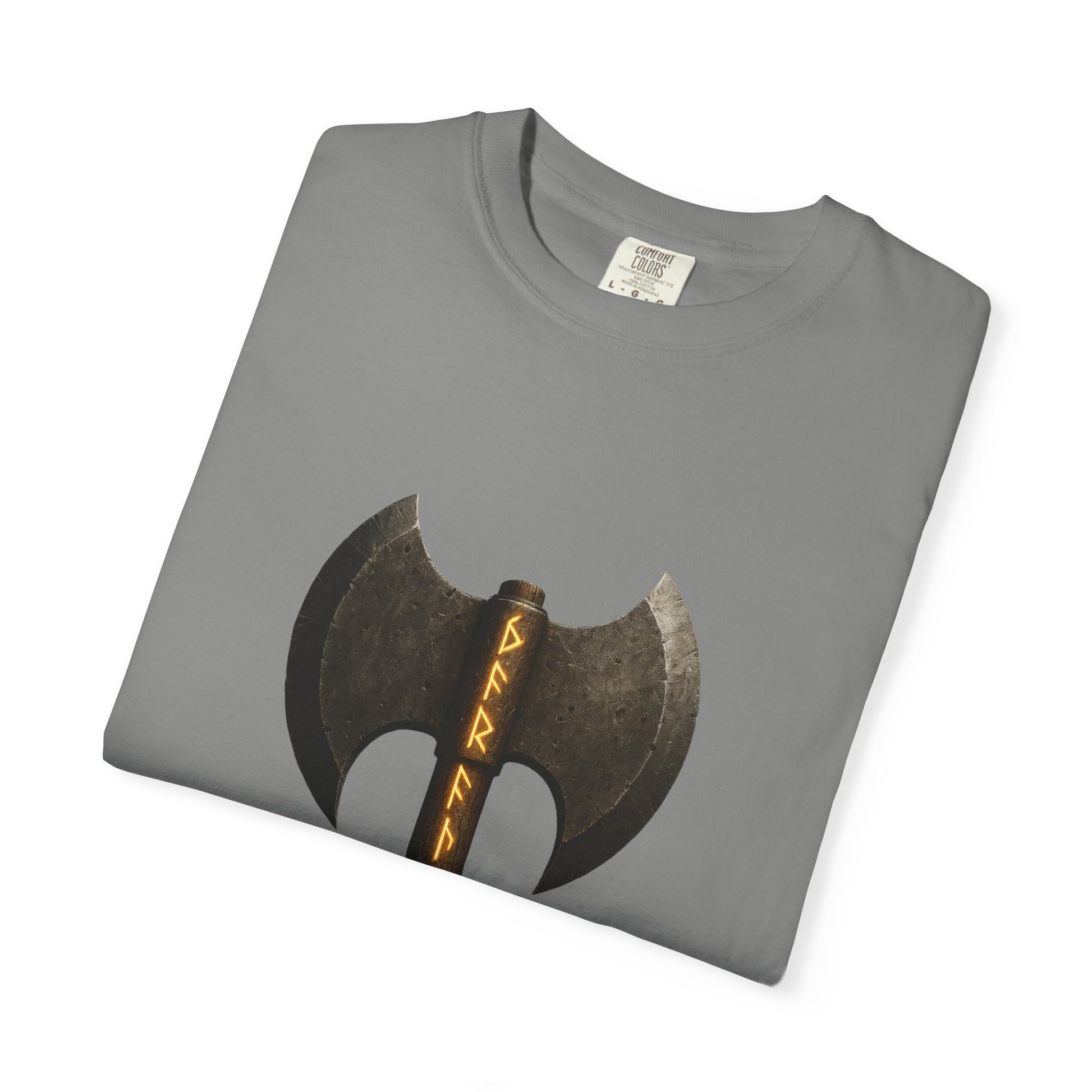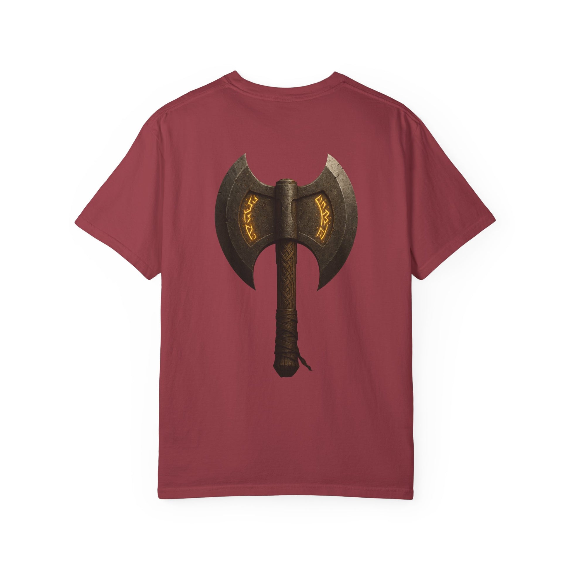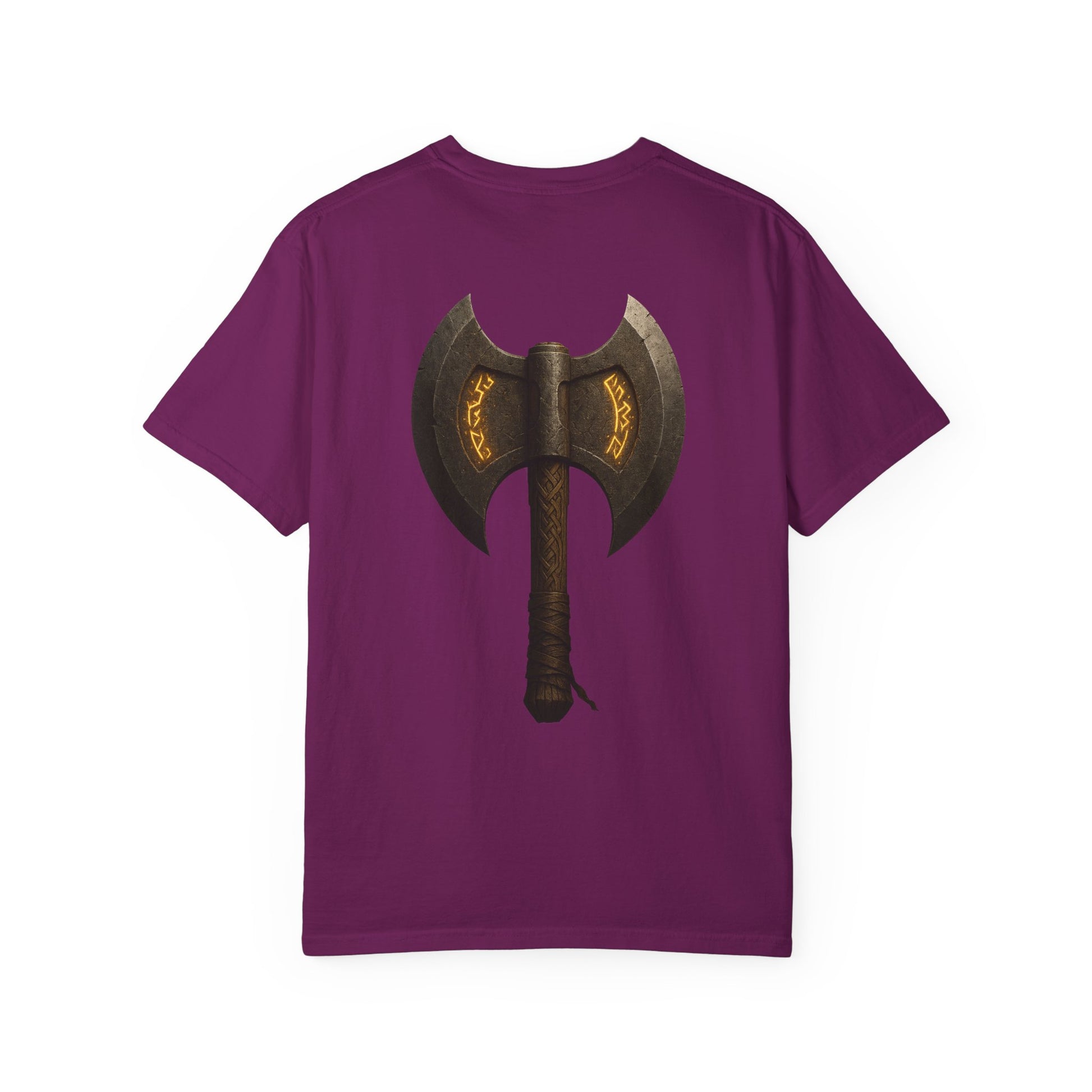 “Colossus’ Oath” embodies the mythic might of Elbaf’s giants through Loki’s twin axes. The front graphic presents one weapon in hyper-realistic detail, its glowing runes radiating ancient power. The back mirrors its twin, completing the set — as if the wearer shoulders the burden of a warrior’s arsenal. Knotwork engravings, stone-etched cracks, and fiery runes give the shirt a battle-forged authenticity. This piece feels less like clothing and more like an heirloom — a tribute to the awakening of giant kings.