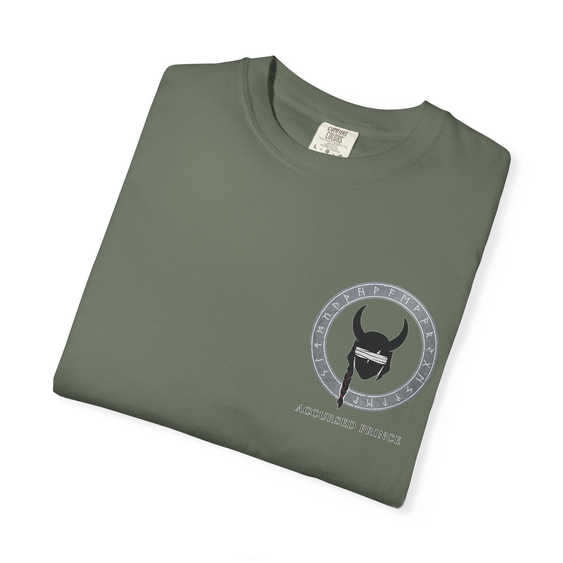 Minimal yet powerful — Loki’s horned helm sits within a circular crest, paired with the title “Accursed Prince.” A stark emblem piece that feels like a sigil carved from giant stone.