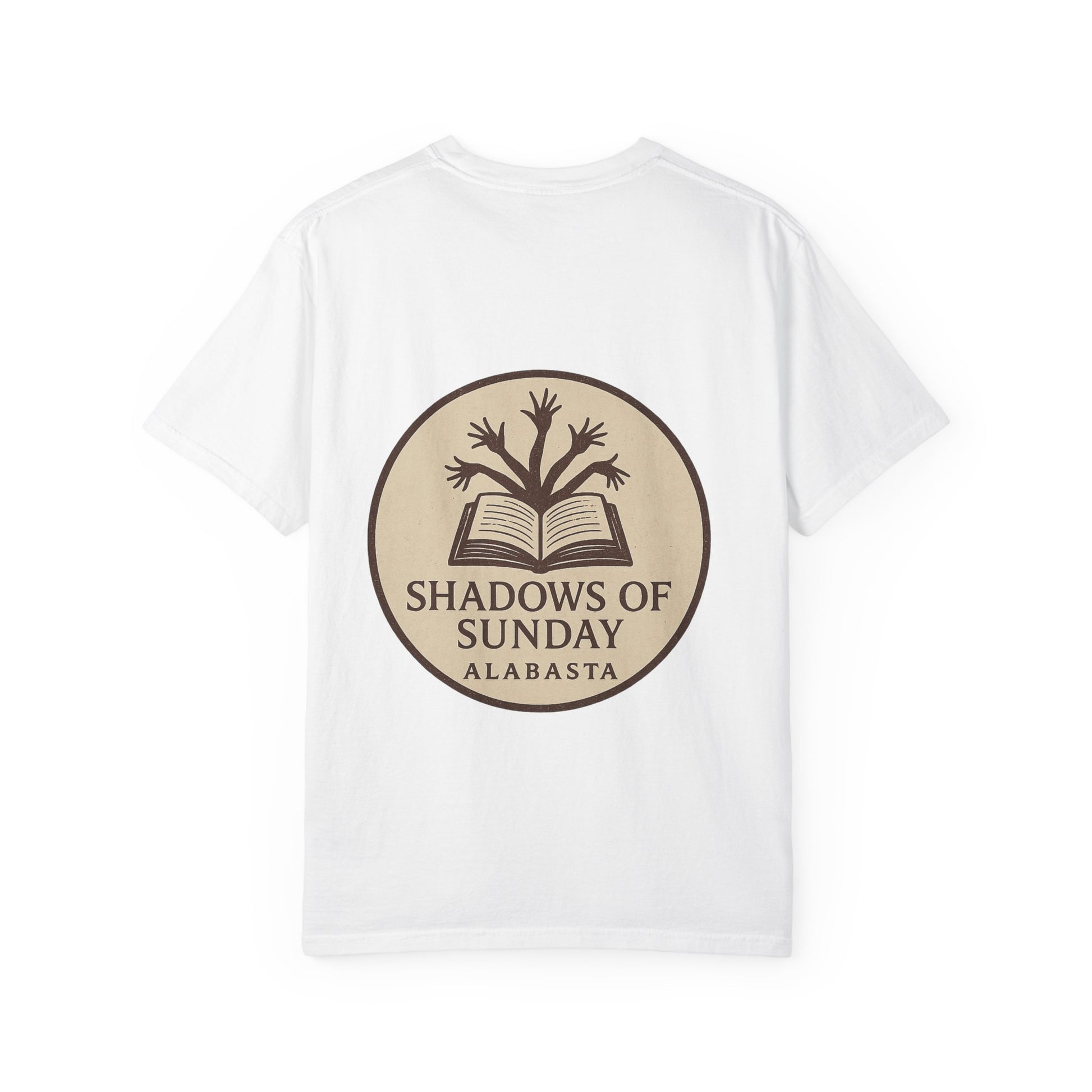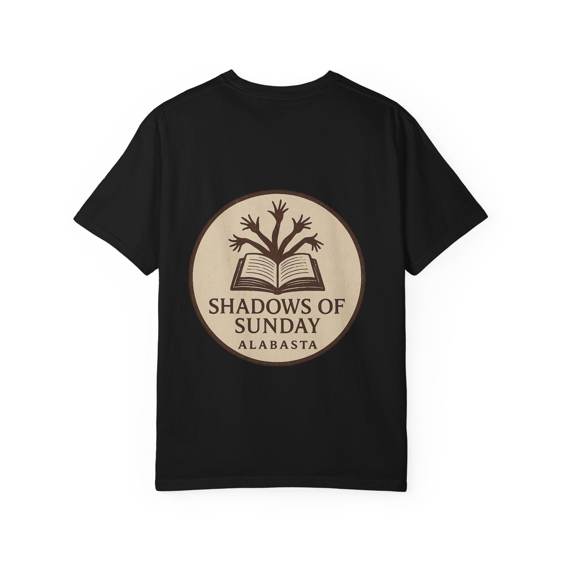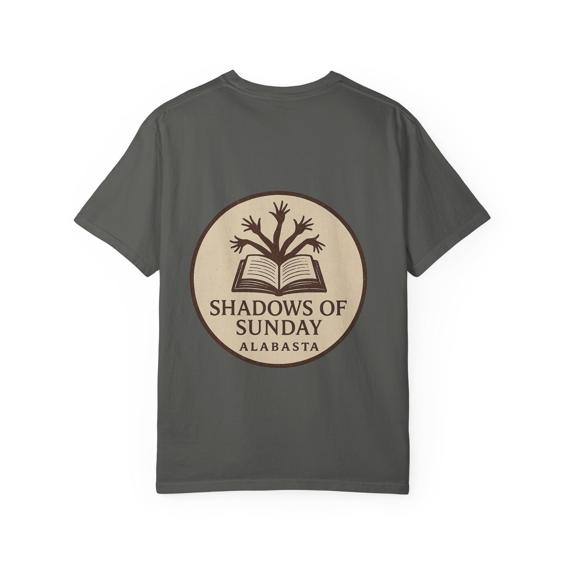 The back design completes the look with a vintage-style emblem: an open book with sprouting arms curling upward like branches, stamped with the title “Shadows of Sunday – Alabasta.”
