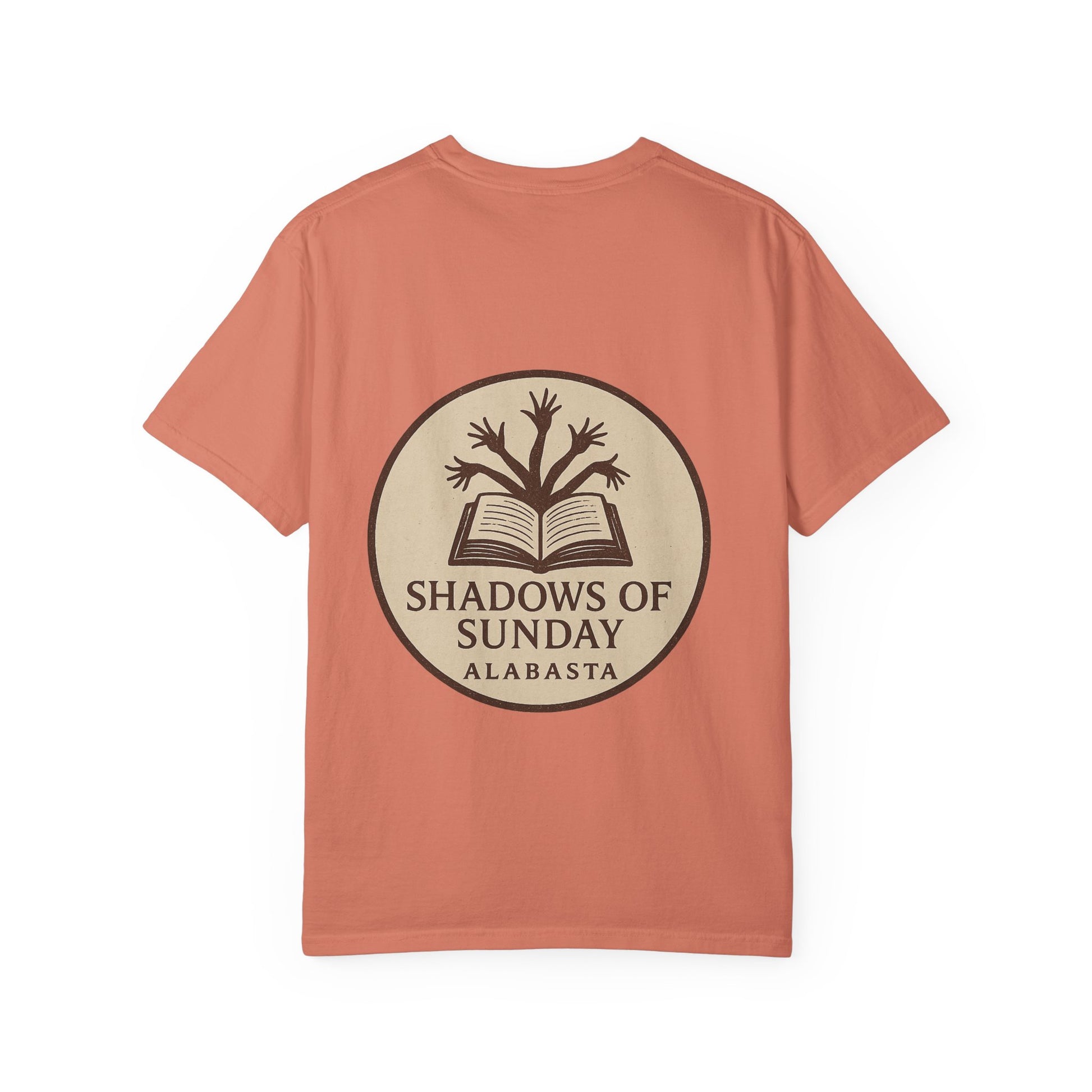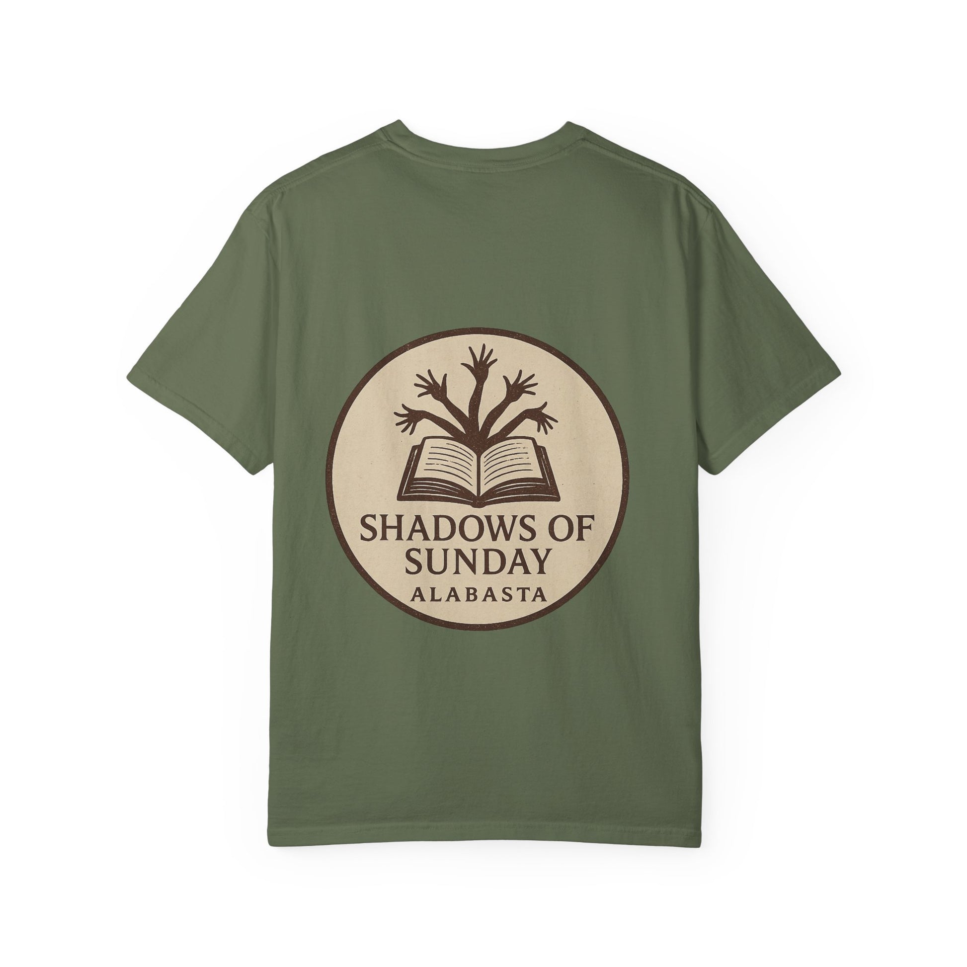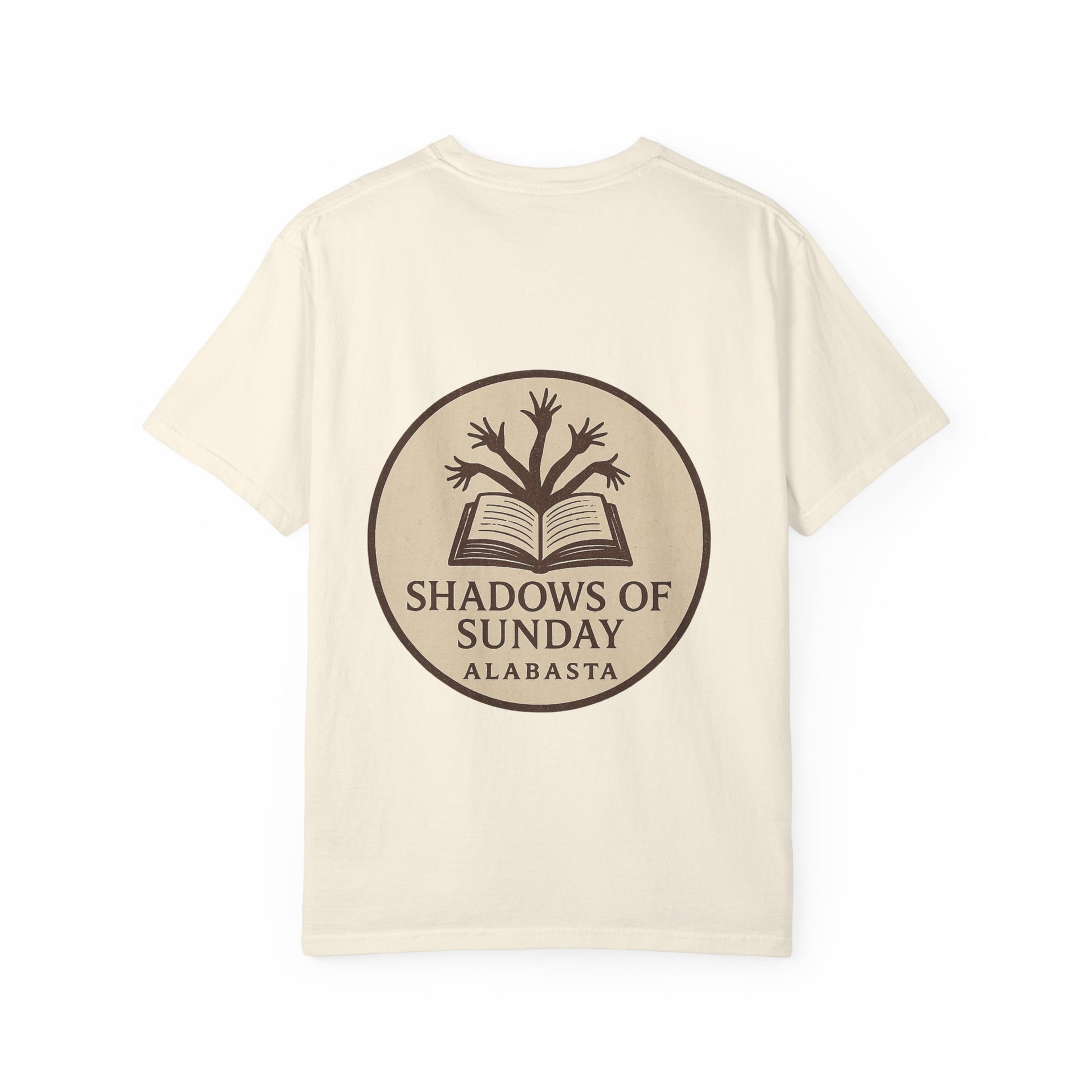 The back design completes the look with a vintage-style emblem: an open book with sprouting arms curling upward like branches, stamped with the title “Shadows of Sunday – Alabasta.”
