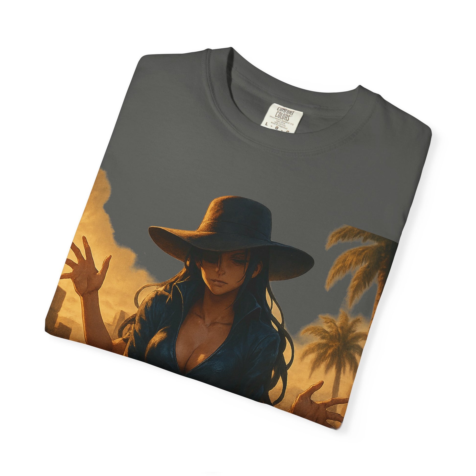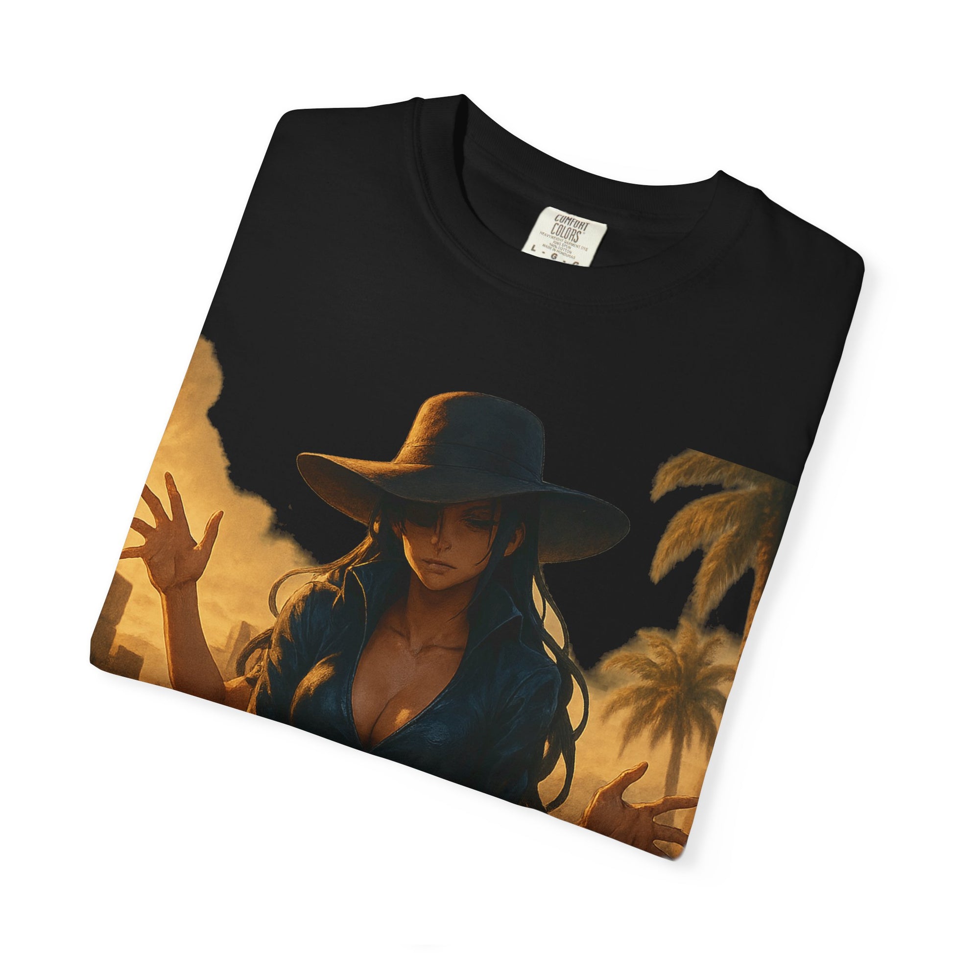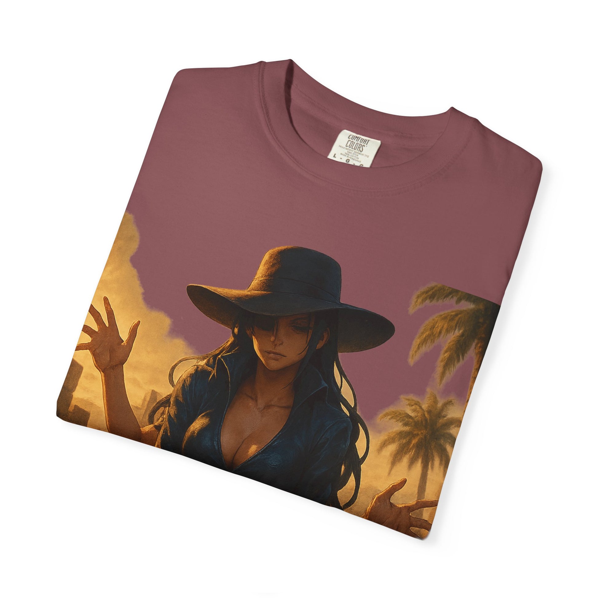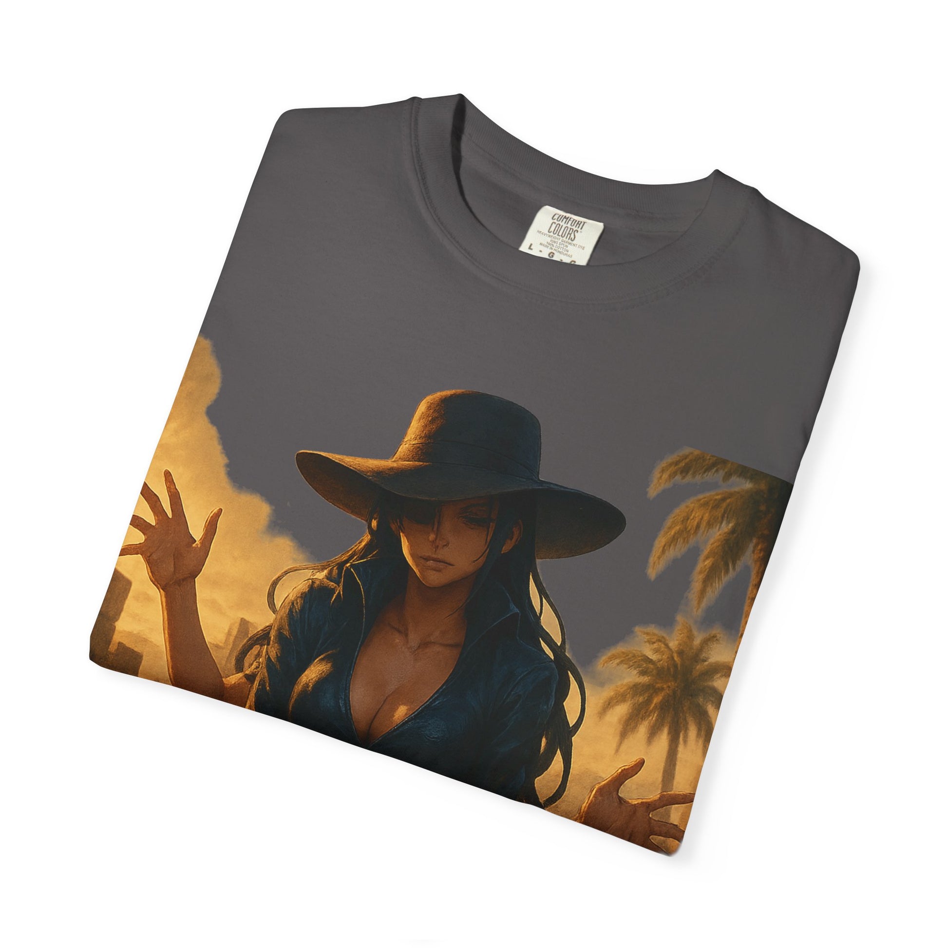Printed on the Comfort Colors 1717 Garment-Dyed Tee, this piece combines hyper-detailed anime artwork with timeless, minimalist branding — balancing Robin’s refined presence with her lethal ability.