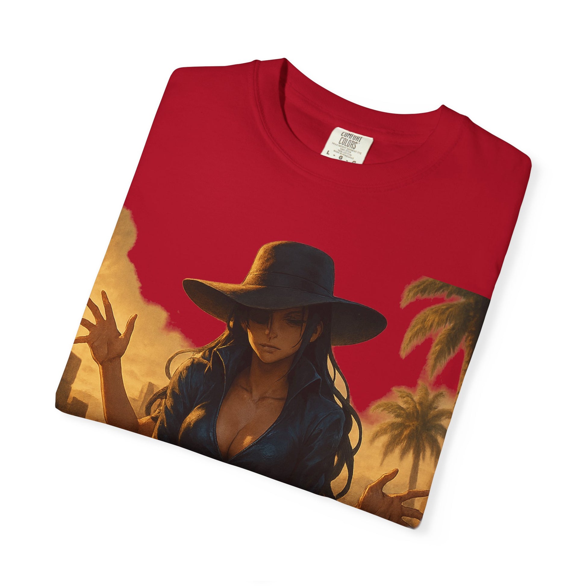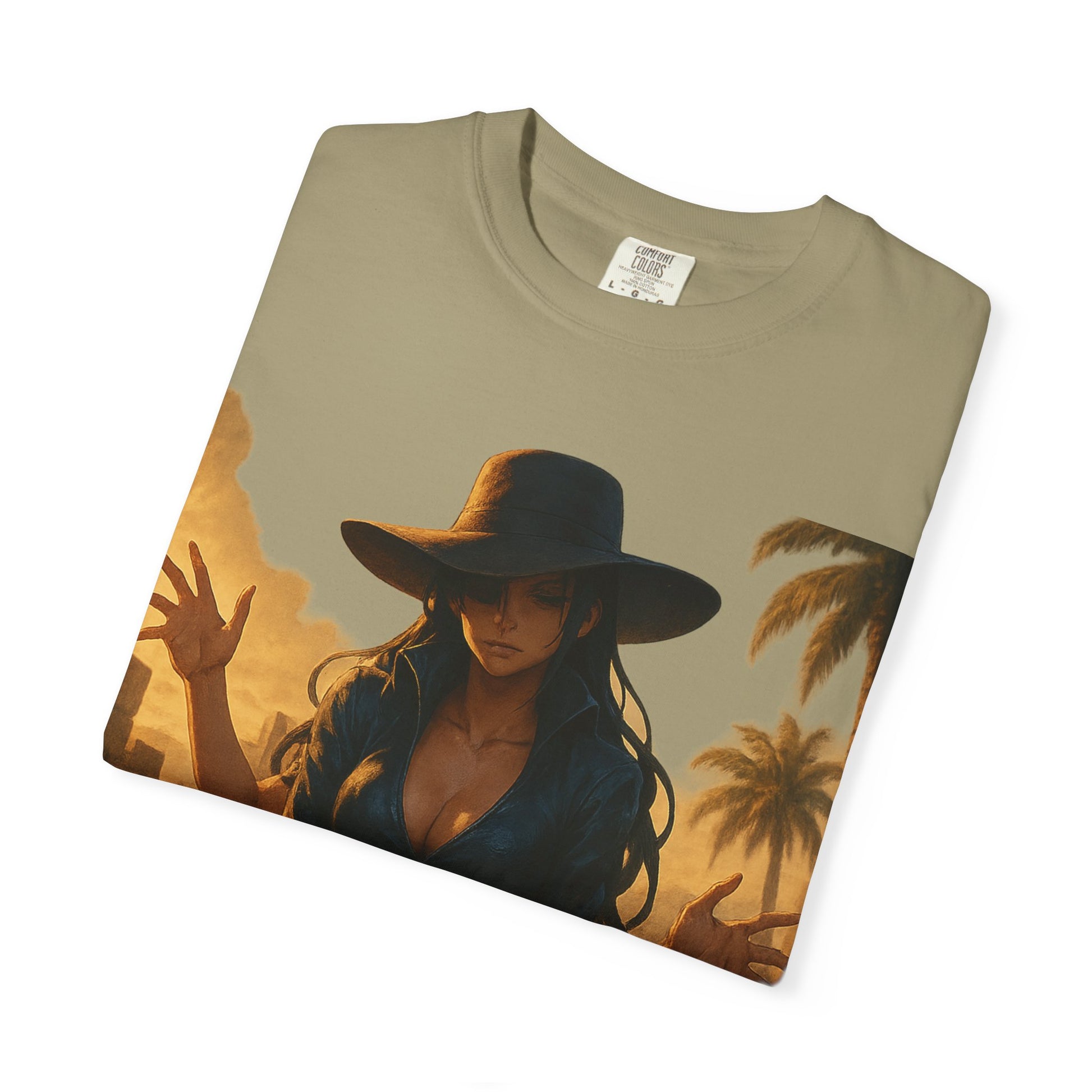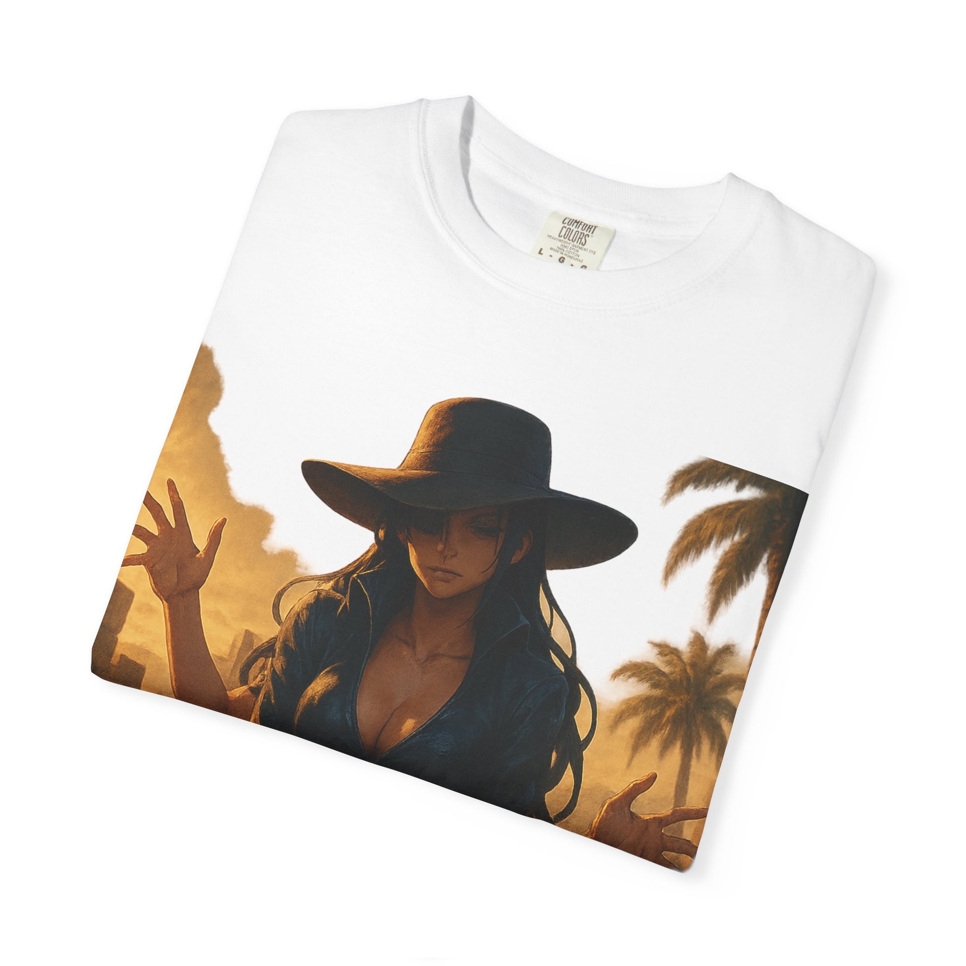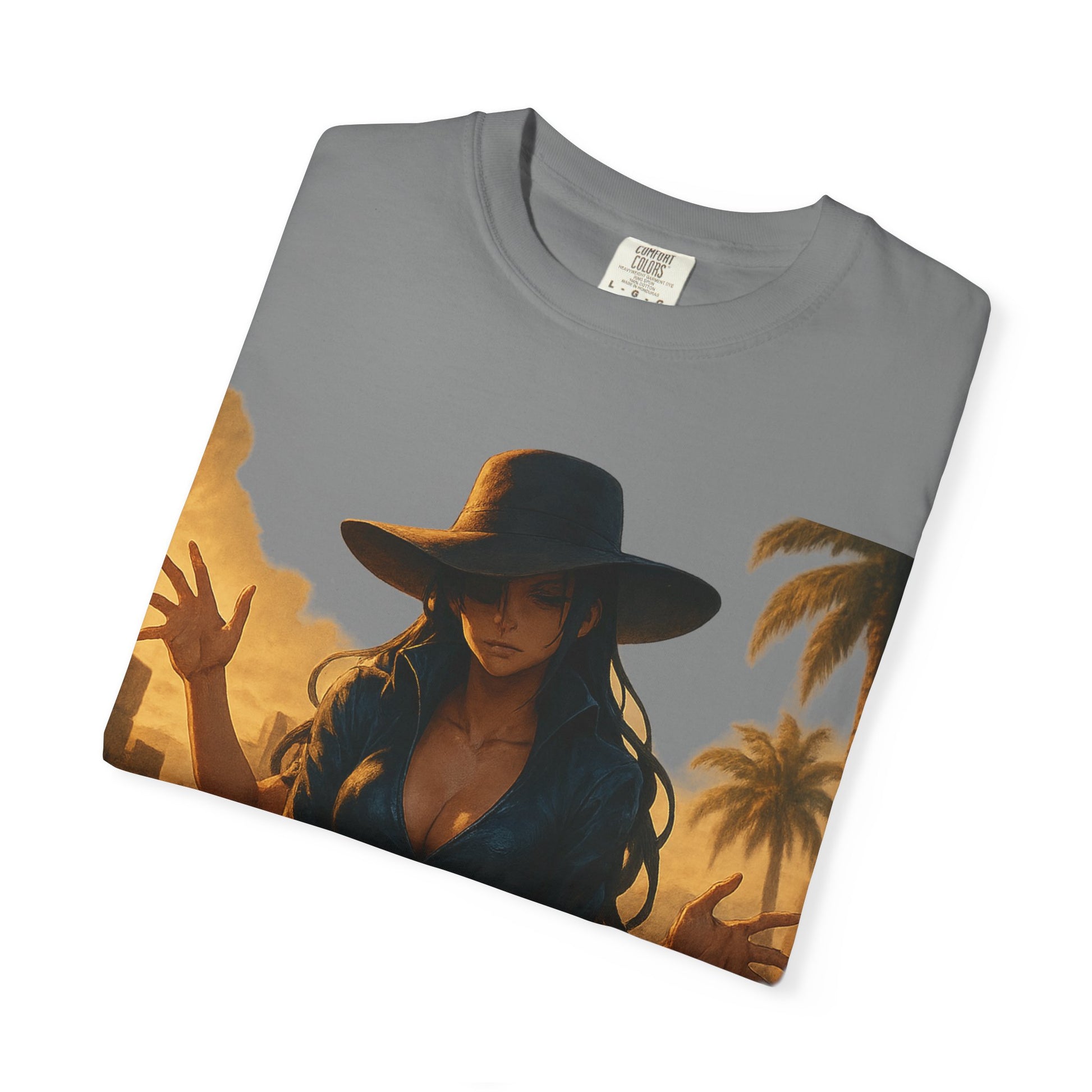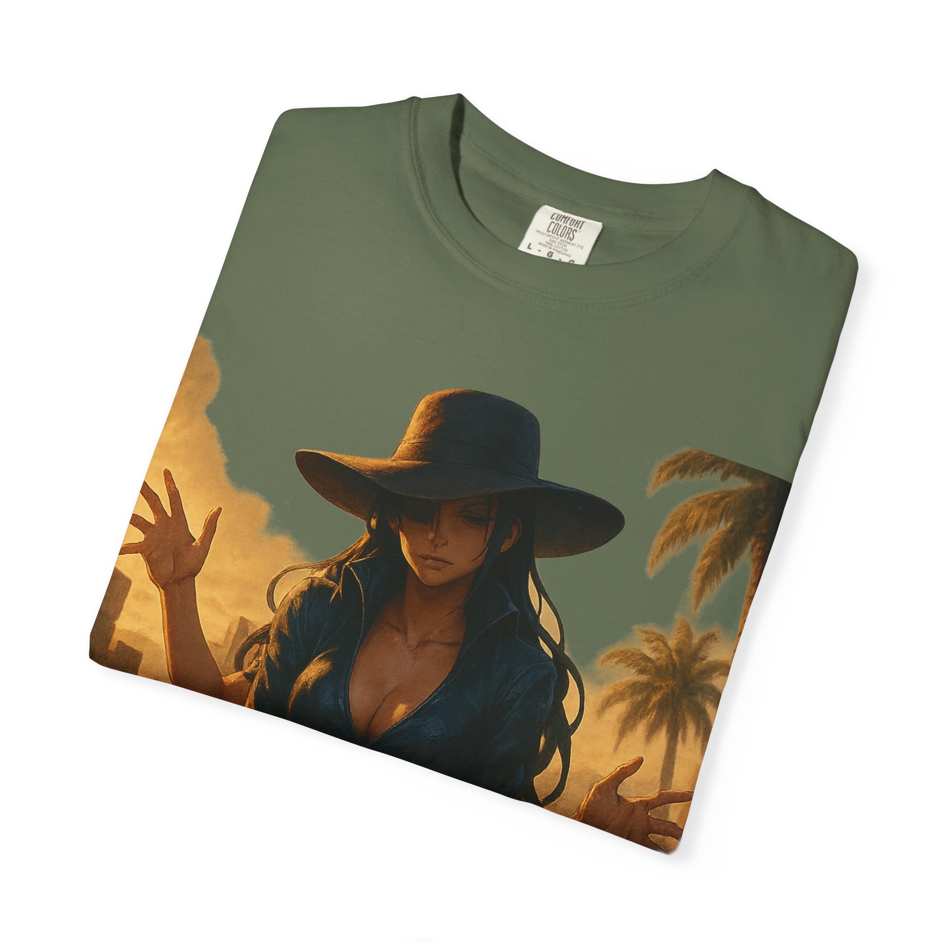 Printed on the Comfort Colors 1717 Garment-Dyed Tee, this piece combines hyper-detailed anime artwork with timeless, minimalist branding — balancing Robin’s refined presence with her lethal ability.