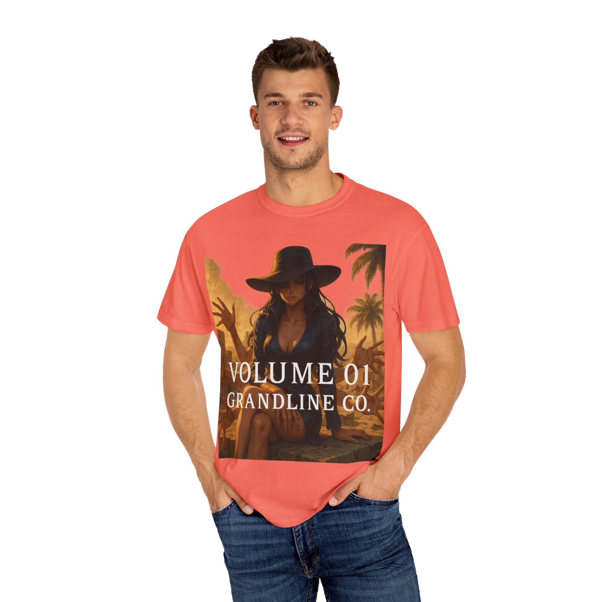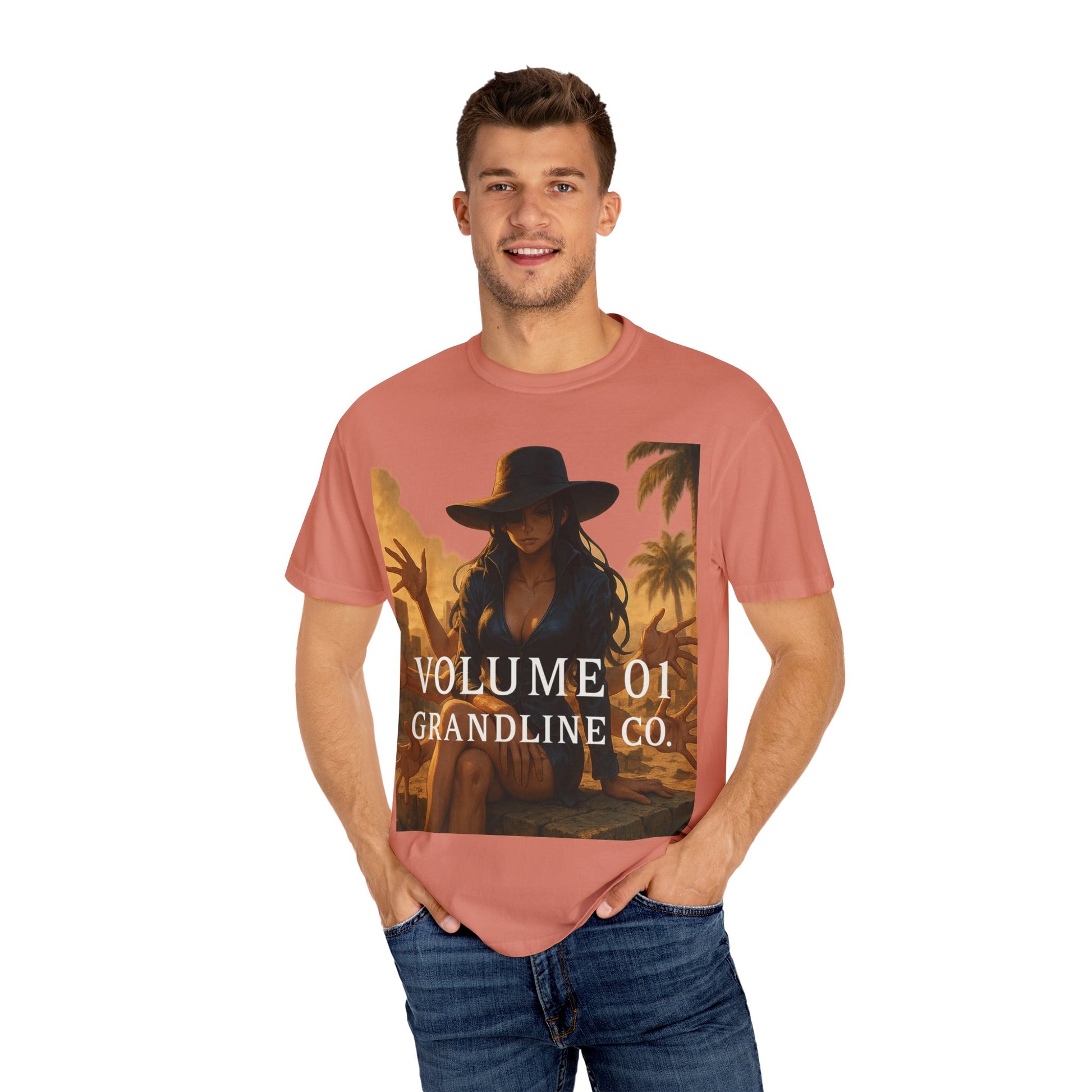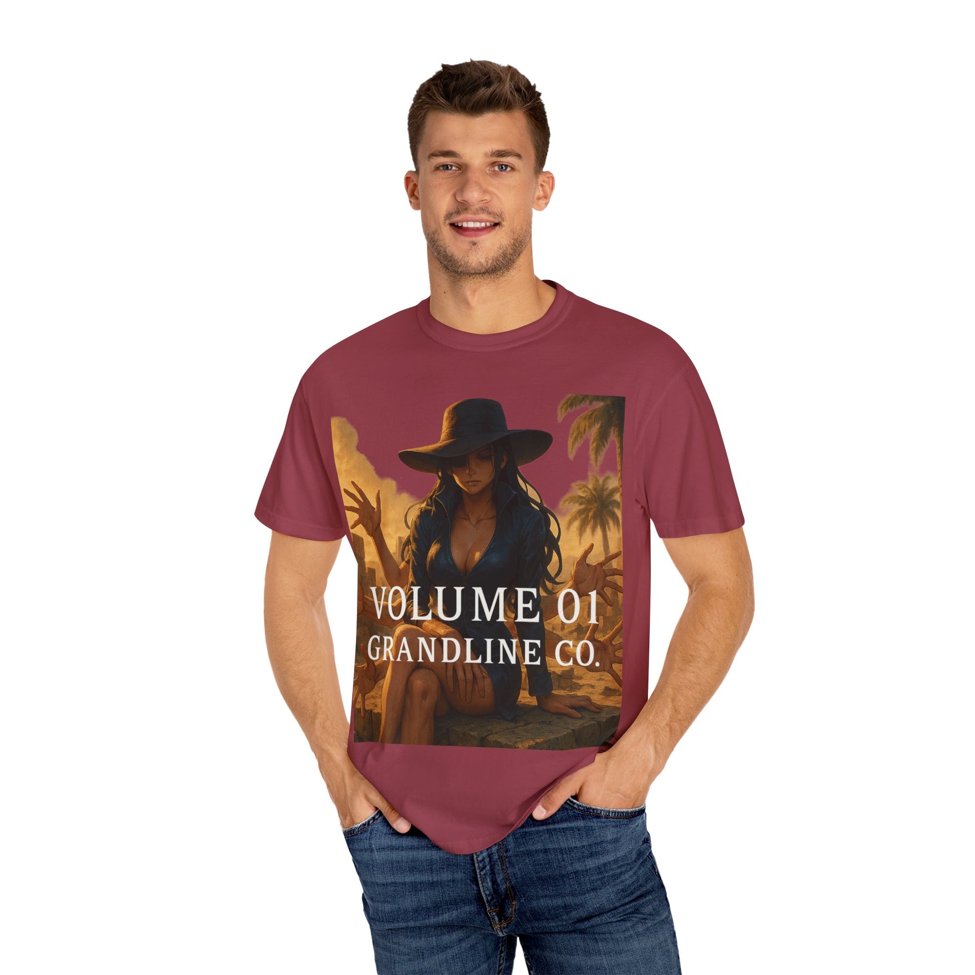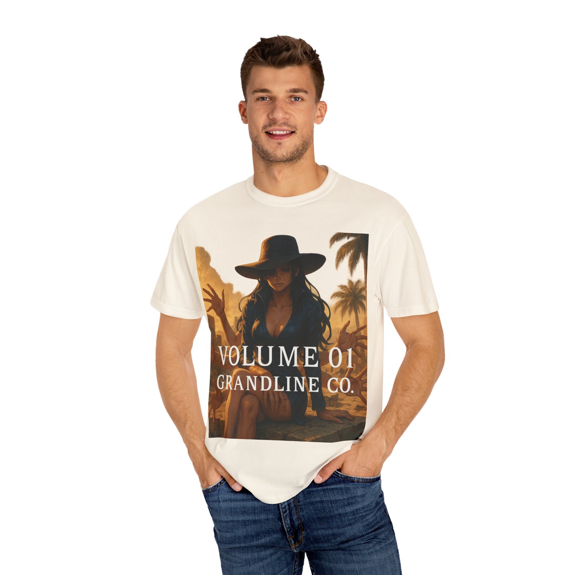Printed on the Comfort Colors 1717 Garment-Dyed Tee, this piece combines hyper-detailed anime artwork with timeless, minimalist branding — balancing Robin’s refined presence with her lethal ability.