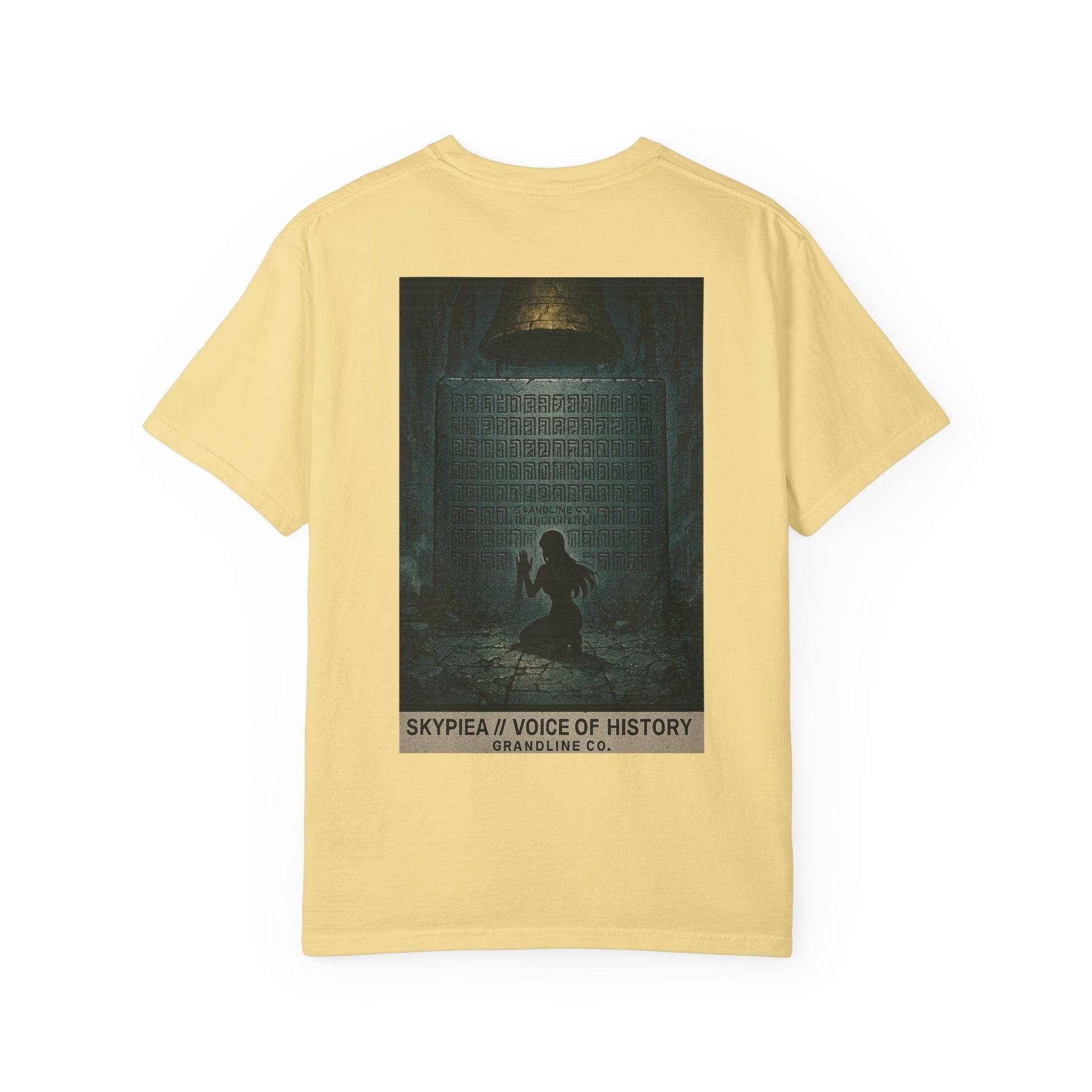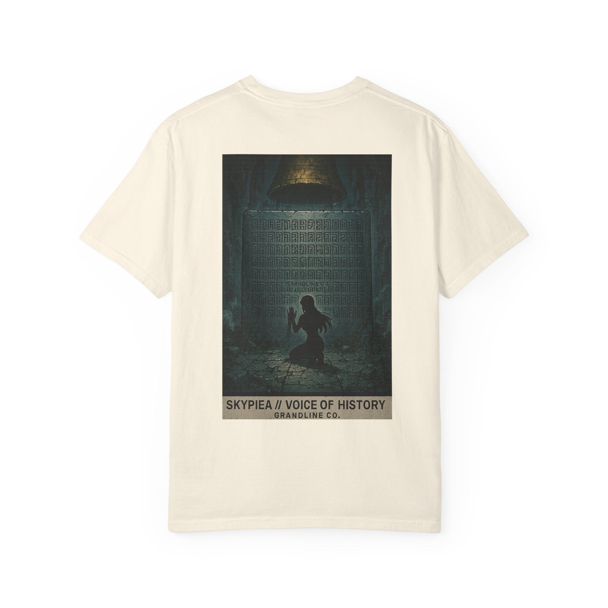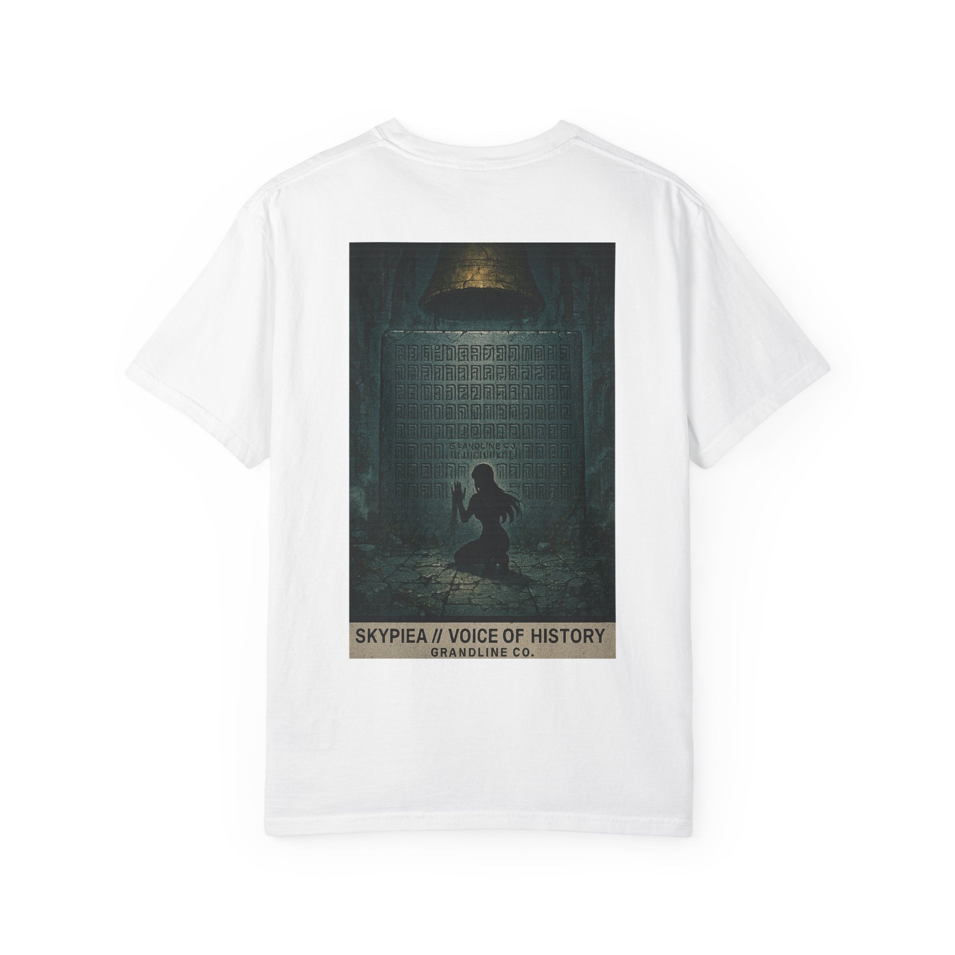 The back design expands the mystery into a cinematic scene: a lone figure kneeling before a towering stone tablet beneath the golden bell, the air heavy with silence and reverence. Hidden within the inscriptions, “Grandline Co.” is faintly etched, blending brand identity with mythic secrecy.