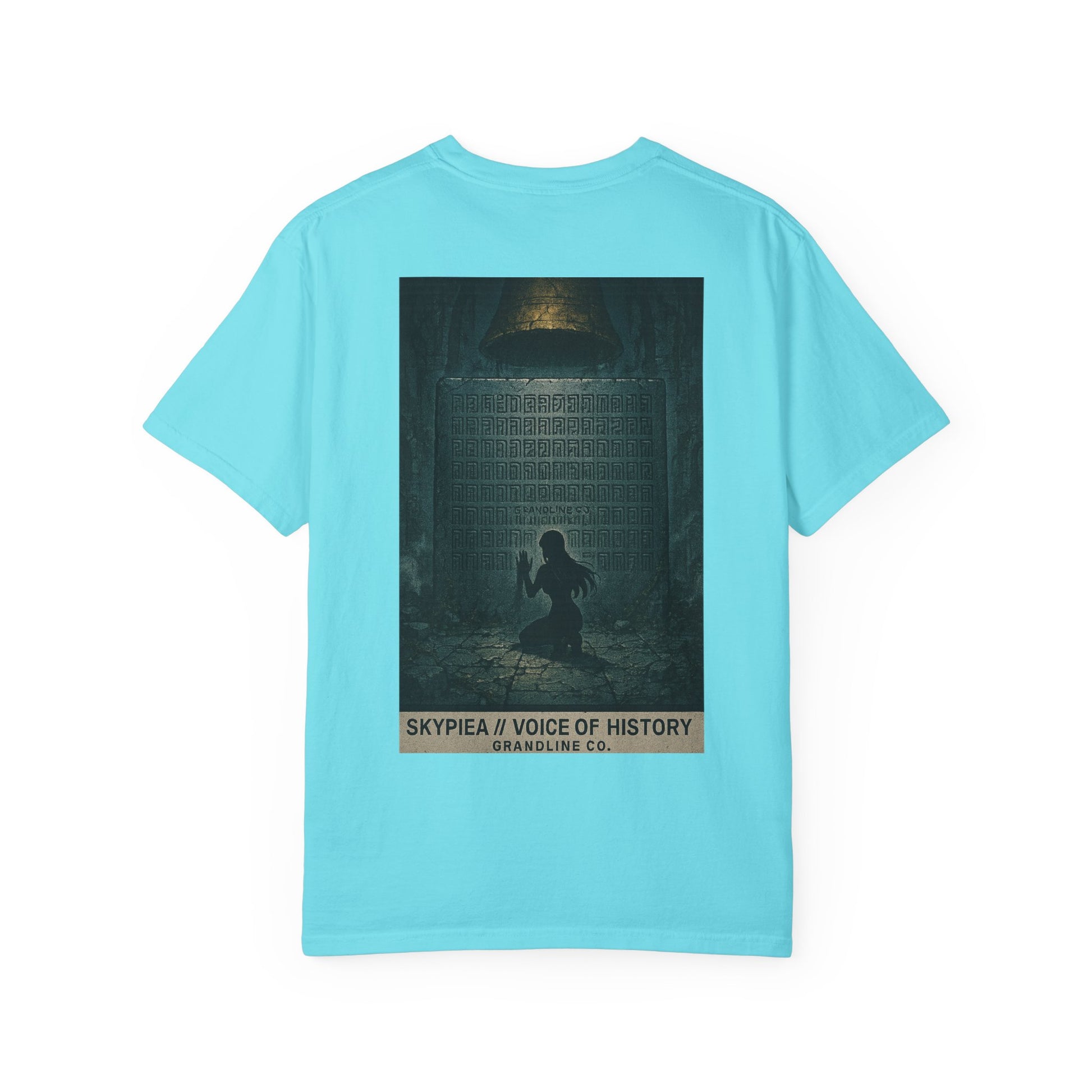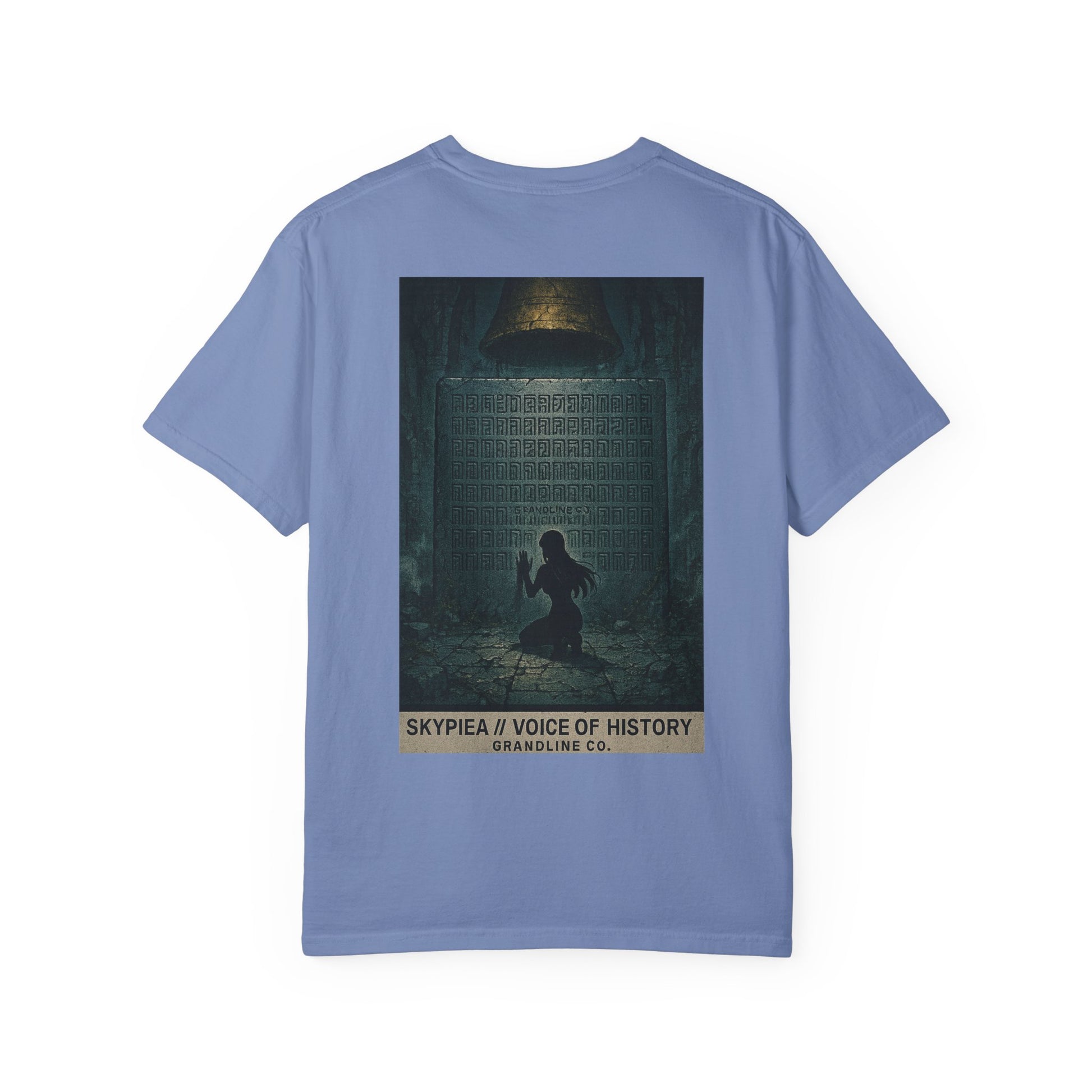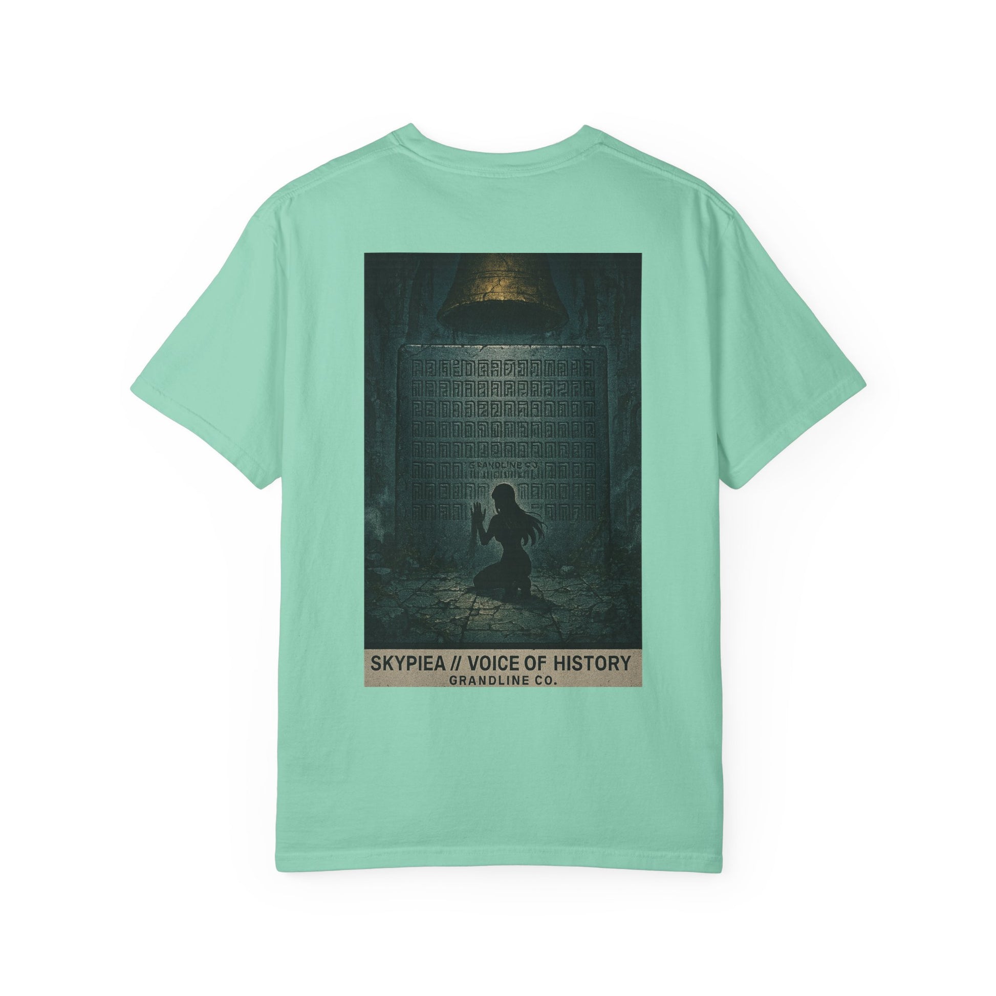 The back design expands the mystery into a cinematic scene: a lone figure kneeling before a towering stone tablet beneath the golden bell, the air heavy with silence and reverence. Hidden within the inscriptions, “Grandline Co.” is faintly etched, blending brand identity with mythic secrecy.